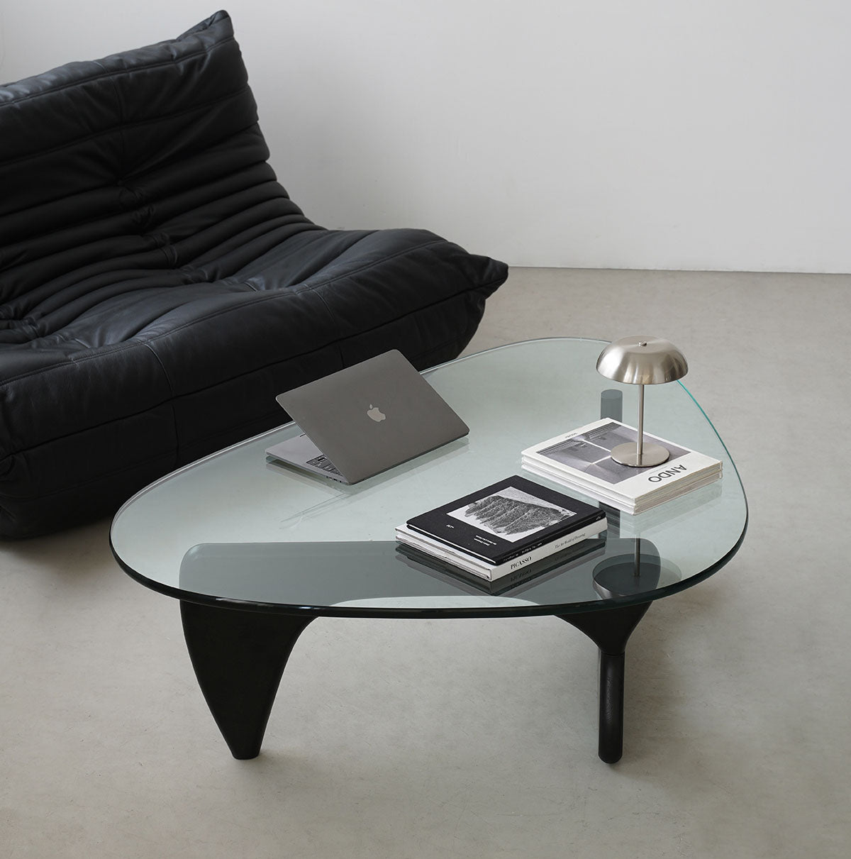 イサム・ノグチ代表作のデザイナーズ家具コーヒーテーブルです。 強化ガラスで作られた天板はオニギリ型をしていますが、3つ全ての丸みが異なるという凝ったデザインで天板の曲線と脚部の造形がノグチのオリジナルラインを象徴しています。