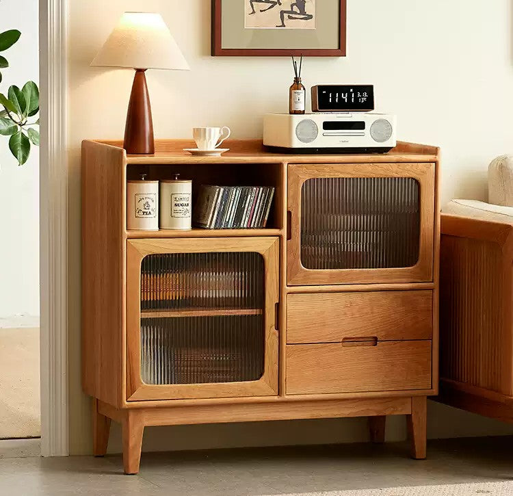 無垢材とガラスの高級感あふれるキャビネット。モダンかつスタイリッシュなデザインでお部屋を上品に演出し、耐久性を提供する頑丈な多層板構造。キャスター付きで移動も簡単。コンパクトなサイズ感が小さなスペースにもぴったり収まり、見せる収納と隠す収納を兼ね備えた機能性も魅力。一つ一つ異なる木目模様が、あなただけの特別な一品に。