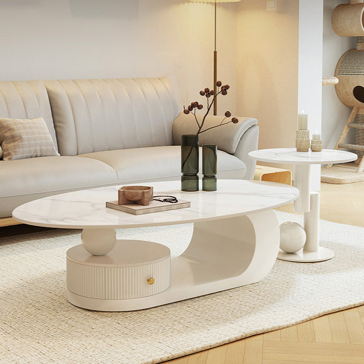 このセンターテーブルは、セラミック天板と引き出しを備えたおしゃれな伸長式のローテーブルです。天板は耐久性があり、引き出しで収納もできます。リビングルームにおいて機能的かつ美しいアクセントになります。