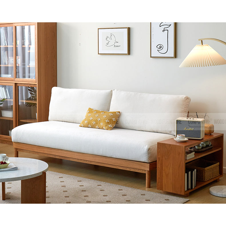 チェリー材と無垢材を使用しているので、自然な木の温もりと質感が魅力です。また、無垢材は耐久性が高く、長期間に渡って使用することが可能です。 シリコンフィルとウレタンを使用したクッションは、柔らかく体を支え、長時間座っていても疲れにくい設計になっています。ソファーのクッションカバーは取り外しが可能で、洗濯やお手入れが簡単に行えるため、いつも清潔に保つことができます。 自然素材を使用しているため、環境に優しい家具と言えます。サステナブルな生活を心がける人にも適しています。 サイズ ※若干の個体差があるため、表記サイズにおいて±3cm 程の誤差が生じる場合があります。 梱包サイズ 幅210cm × 奥行き95cm × 高さ30cm 42+210 kg幅190cm ×...