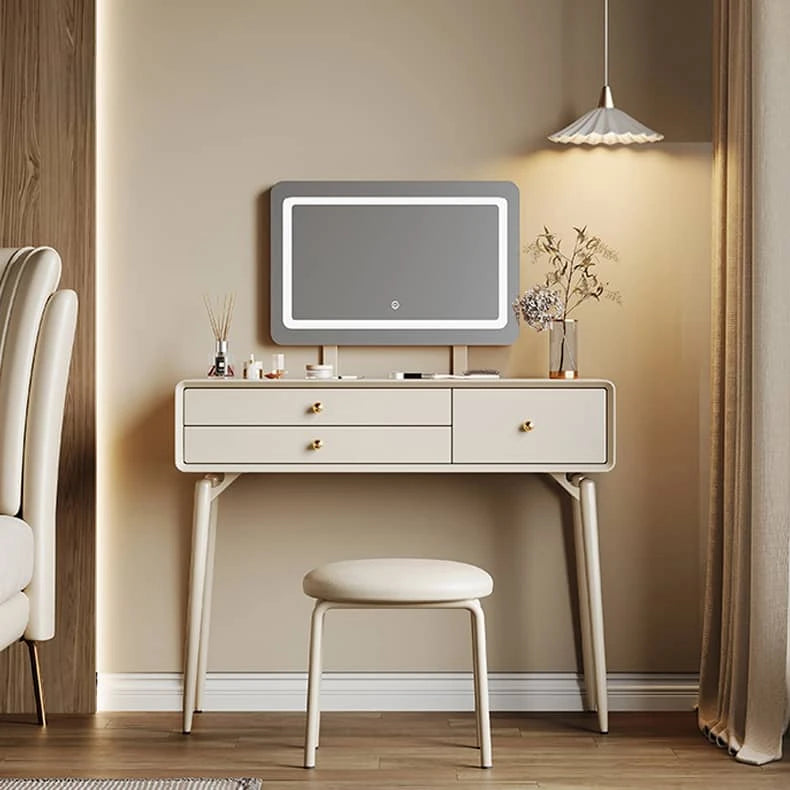 多機能性と洗練されたデザインを兼ね備えた化粧台です。延長式デスク機能により、メイクアップスペースとしてはもちろん、デスクやワークテーブルとしても活用できます。下部に便利なチェスト付きで、コスメやアクセサリー、日用品などをすっきり整理・収納できます。ミラーは別売りのため、お好みのサイズやデザインを自由に選べます。限られたスペースを有効活用したい方や、機能性重視の方に最適な一台です。
