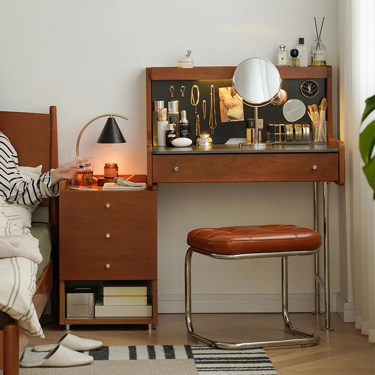 このおしゃれなドレッサーは、収納スペース付きで無垢材を使用しました。ブラウンの色合いが温かみをもたらし、お部屋のインテリアを一層引き立てます。毎日のメイクやケアアイテムの収納に最適で、快適な美容体験をサポートします。