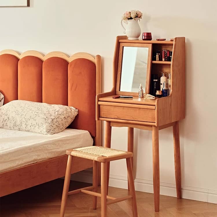 毎日のメイクタイムを特別な時間に変える高級チェリー材の化粧台です。多層板構造による安定性と耐久性を備え、銅の取っ手とゴールドのアクセントが上品さを演出します。お手入れが簡単なガラス天板と美しい鏡面、コンパクトながら収納力抜群のデザインで、限られたスペースでも機能性と美しさを両立。あなたのライフスタイルに寄り添う、長く愛用できる逸品です。