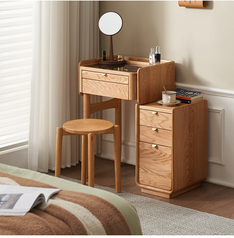 コンパクトなデザインでシンプルでありながらも、機能的なドレッサー。幅55cm、幅75cmの2サイズから選択可能。ナチュラルなオーク材を使用し、引出収納も付いているので、お部屋の収納にも役立ちます。毎日のメイクやおしゃれの時間をより楽しく快適にするためのアイテムです。