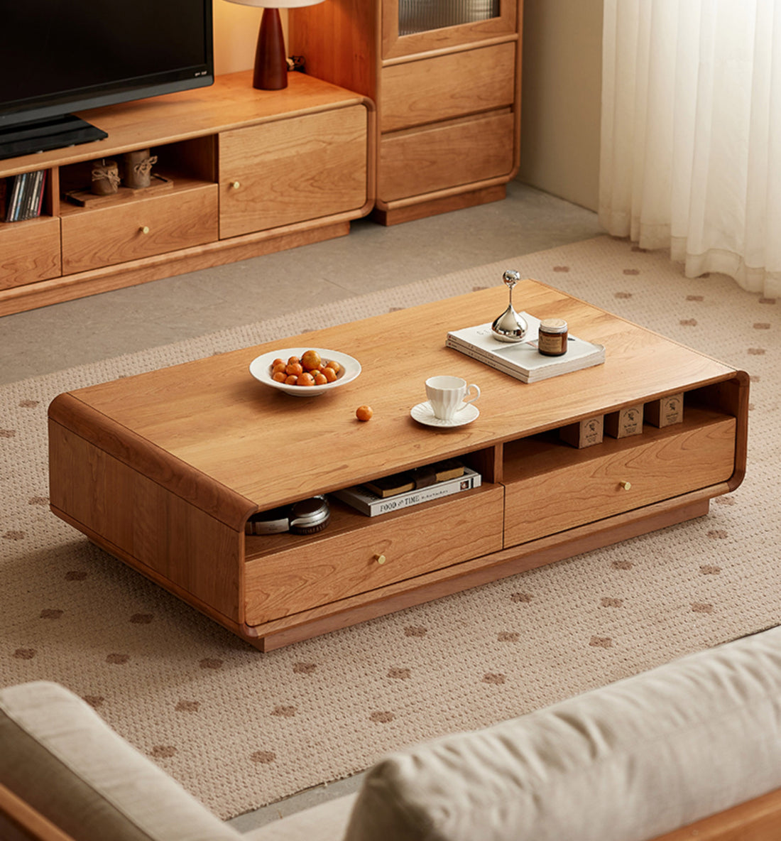 チェリー材の無垢素材を使用したリビング用ローテーブルです。引き出し付き収納ボードが備わり、抜群の収納力でリビングの整理整頓に最適。経年変化で風合いが深まり、長く愛用できるデザインと品質を兼ね備えています。実用性と美しさを両立した高機能なコーヒーテーブルです。