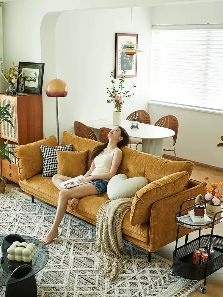クリーム系インテリアに調和するレトロなコーデュロイ素材を使用した、小型の2人掛け・3人掛けソファです。モダンデザイナー風の洗練されたデザインで、限られたスペースにも最適。取り外し可能なカバーはお手入れが簡単で、長く清潔にご使用いただけます。快適な座り心地とスタイリッシュな見た目を両立し、居住空間を上質に演出します。