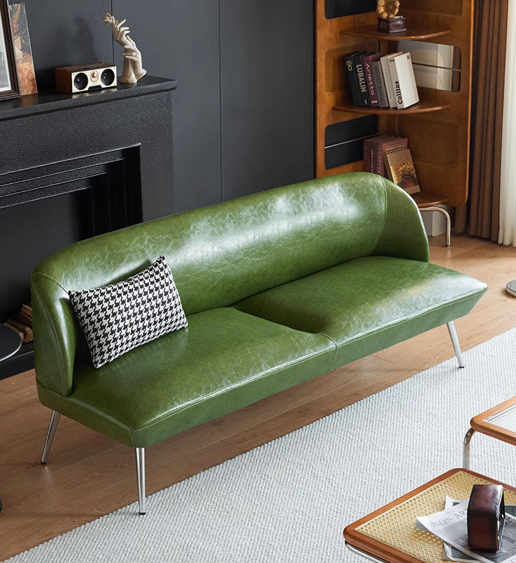 落ち着いたグリーンのオイルワックスレザーが上品な艶を放つヴィンテージ調ソファ。省スペース設計で、小さなリビングや店舗、アパートにも最適です。イタリアンモダンの洗練されたデザインが軽やかなラグジュアリー感を演出し、2~3人掛けのゆったりとした座り心地を実現します。