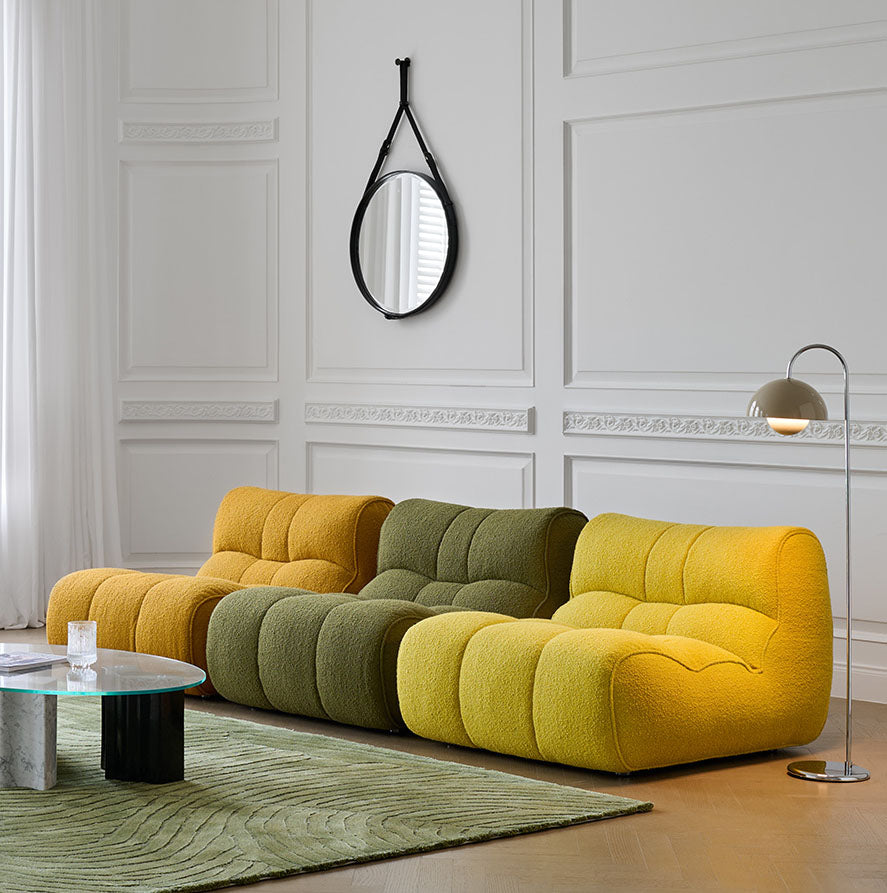 一人掛けソファ「moyu-200」は、上質なシープボア生地を使用したパーソナルソファーです。柔らかく暖かい質感が特徴で、冬場でも快適におくつろぎいただけます。組み合わせ式の設計により、お部屋のスペースや用途に合わせて自由にレイアウト可能。耐久性の高いフレームと快適なクッション性が長時間の座り心地をサポートし、洗練されたデザインで空間を上品に演出します。