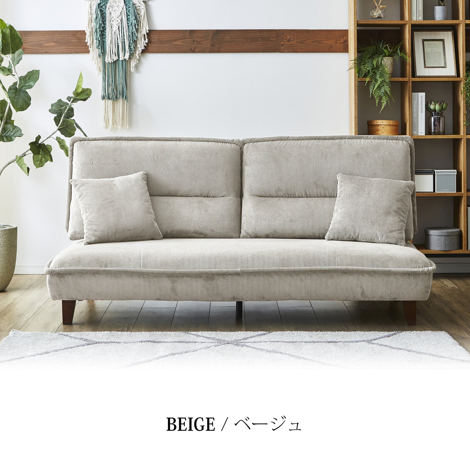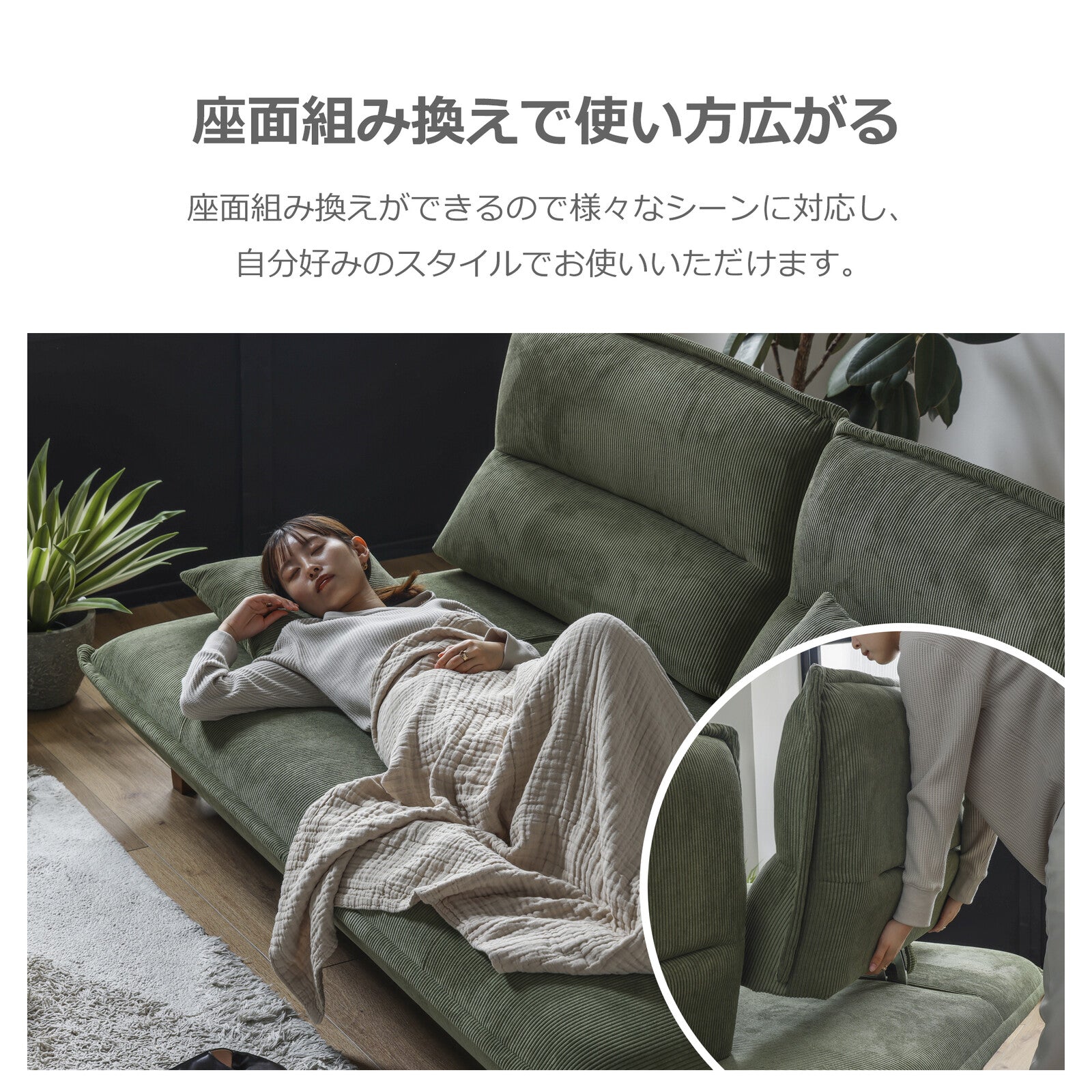 付属のクッションは、膝の上に置いてくつろいだり、枕として使うことも可能です。シンプルなデザインなので、インテリアとしてもお部屋に馴染みます。