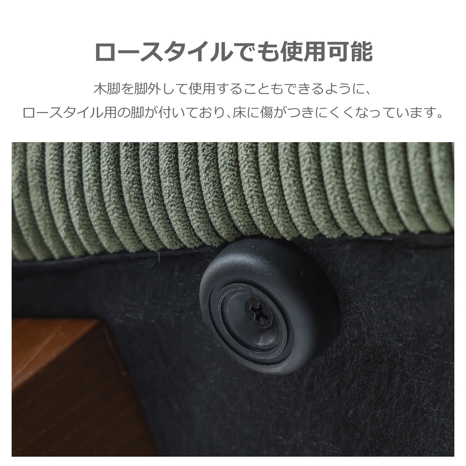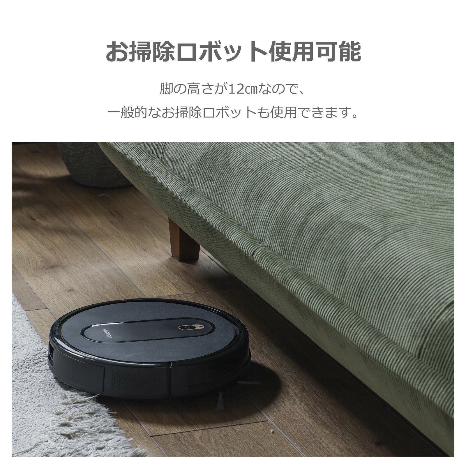 脚部には木材を使用し、温かみのあるデザインに仕上げました。脚高は12cmあり、お掃除ロボットに対応しています。ご使用の際は、ロボットのサイズをご確認ください。