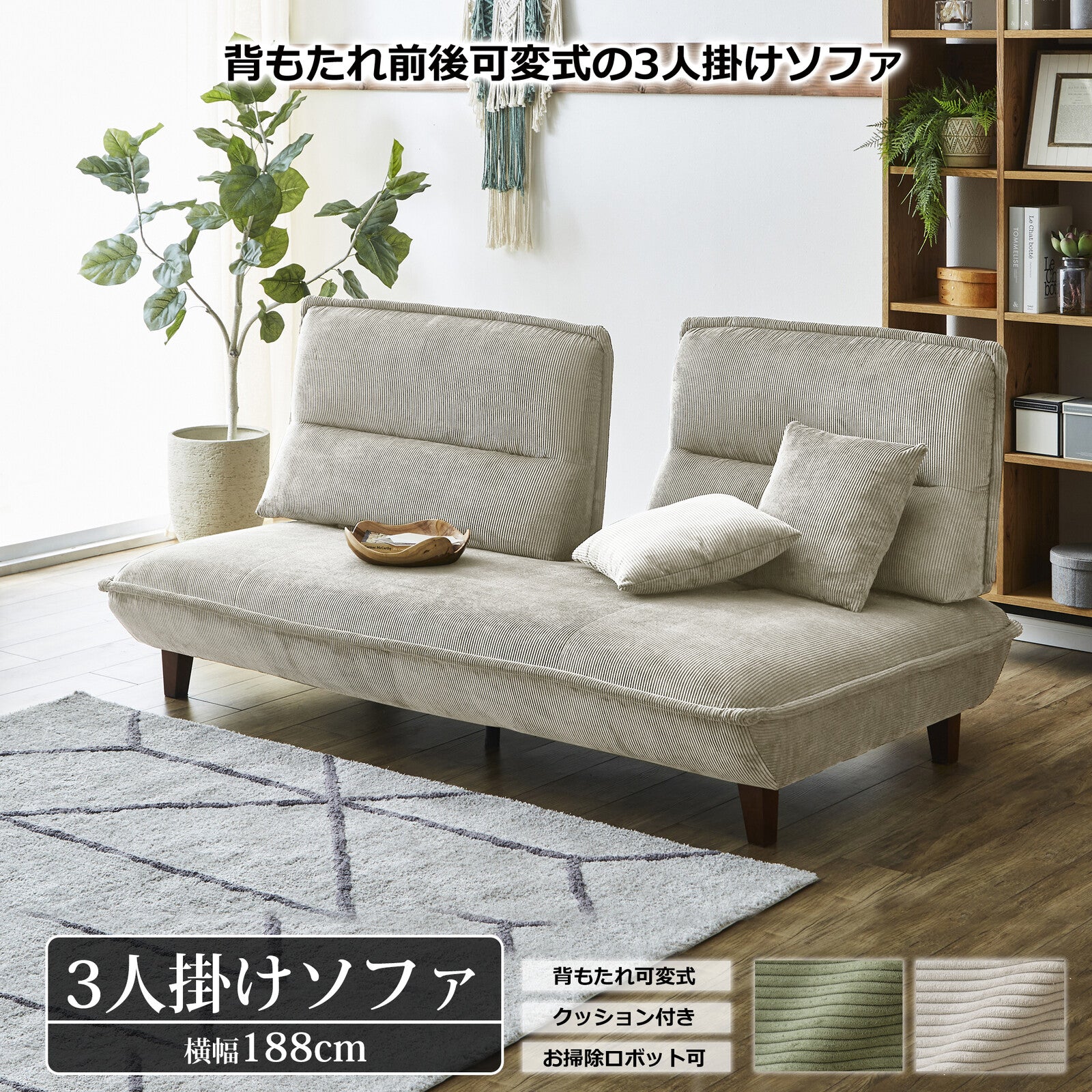 【在庫品】 3人掛けソファ グランパ コーデュロイ生地 背もたれ可動式12467318
