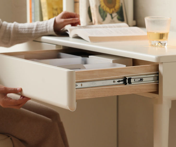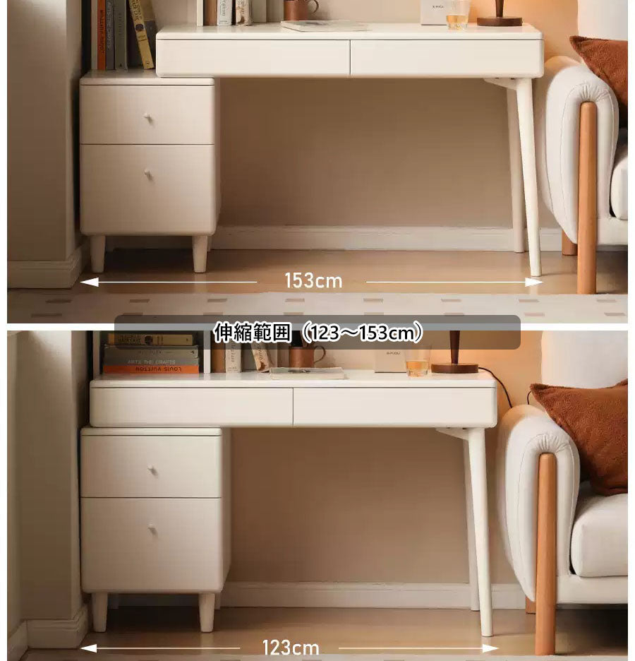 幅103~153cmに伸縮可能なデスクテーブルは、用途や設置スペースに応じて最適なサイズ調整が可能です。引き出し付きで文具や小物の収納に便利で、作業効率を高めます。頑丈な構造とシンプルなデザインにより、オフィスや家庭のどちらでも長期間快適に使用できる実用的なデスクです。