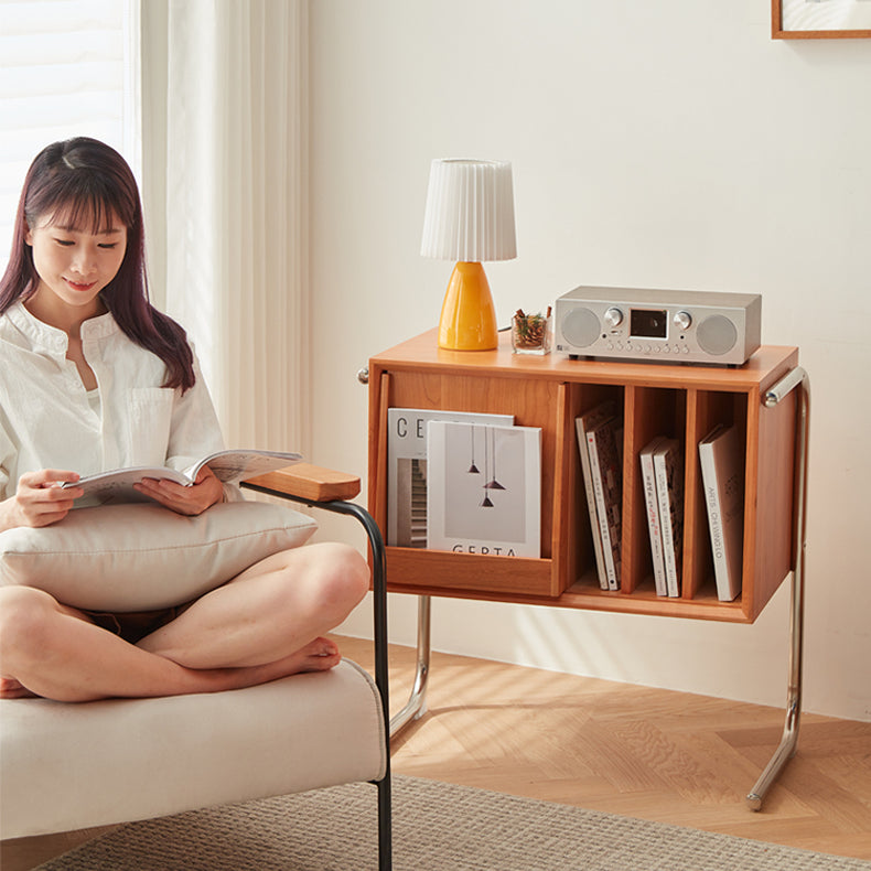 チェリー材を使用した高級キャビネットは、耐久性に優れ、使い込むほどに深まる色合いが魅力です。ステンレスの装飾と取っ手がモダンなアクセントを加え、洗練された空間を演出します。オープン棚は書籍やアート作品のディスプレイに最適で、上部にはラジオやランプを置けるスペースを確保。コンパクトながら十分な収納力を持ち、どんなインテリアにも調和します。長期使用に耐える素材で、経済的な価値も高い一品です。