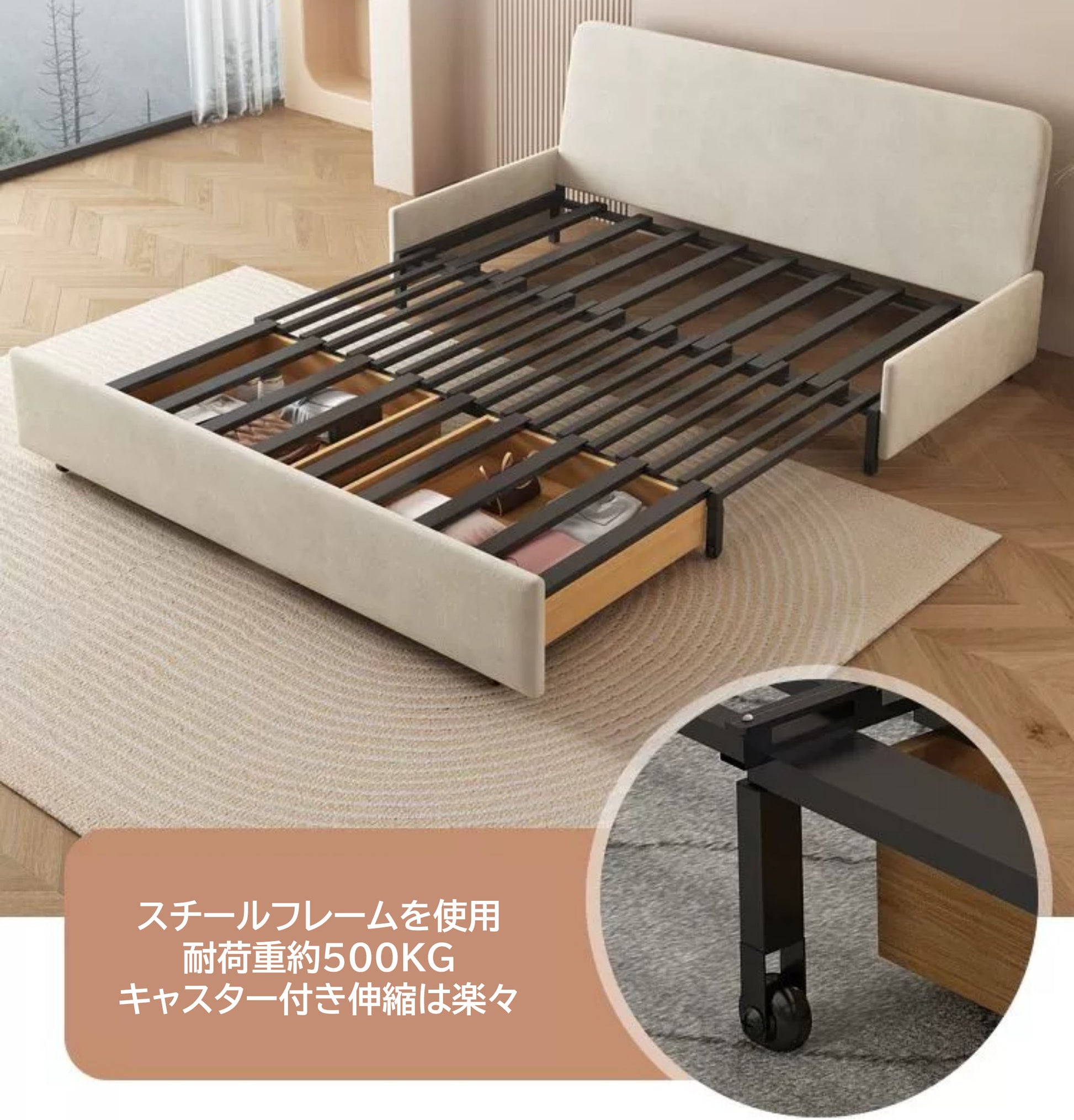 快適さと機能性を兼ね備えたダブルサイズのソファーベッドです。2人掛けのソファとしてリビングで活躍し、来客時やお休みの時間にはベッドへと変身します。折りたたみ機能で省スペース対応が可能で、下部の収納スペースは季節用品や寝具の整理に便利です。温かみのあるベージュカラーはどんなお部屋にも馴染みやすく、インテリアを選びません。限られたスペースを最大限に活用したい方や、多機能家具をお探しの方に最適な一台です。