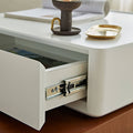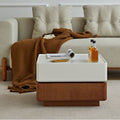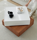 モダンデザインと機能性を兼ね備えたセンターテーブルです。白い天板と美しい木目の下部が織りなすコントラストが空間に洗練された印象を与えます。集成材と金属フレームの組み合わせにより耐久性と安定感を実現。2層構造で下部スペースには雑誌やリモコンを収納でき、お部屋をすっきり保てます。ニュートラルカラーで様々なインテリアスタイルに調和します。