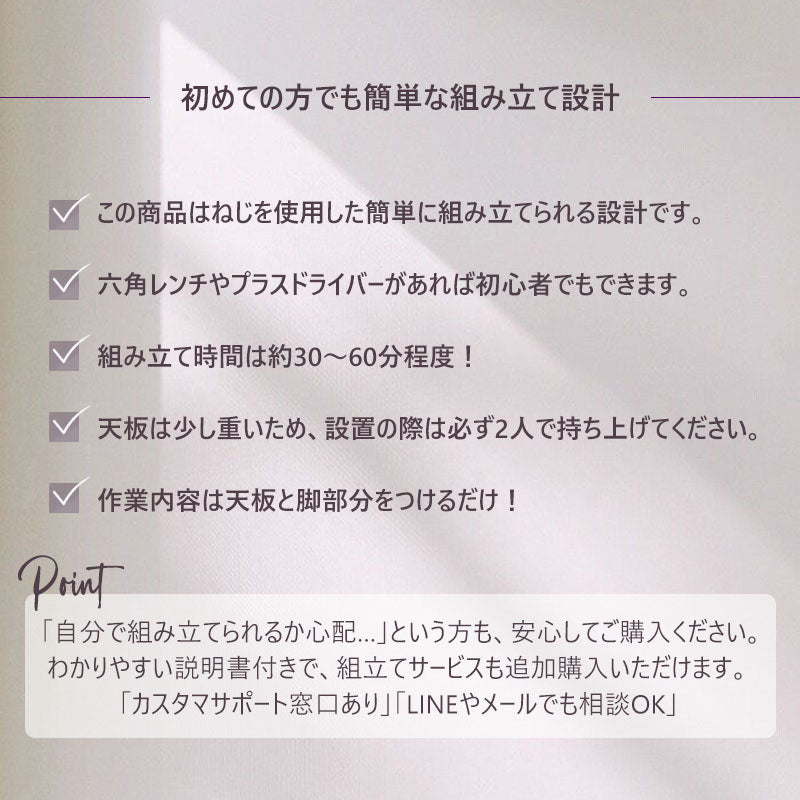 運搬上の都合や製造工程上、天板取り付け面に加工時に発生するスレ傷や研磨跡が見られる場合があります。組立て時の見た目に影響しないため、通常商品として提供させていただいています。ご理解の上ご注文くださいますようお願いいたします。