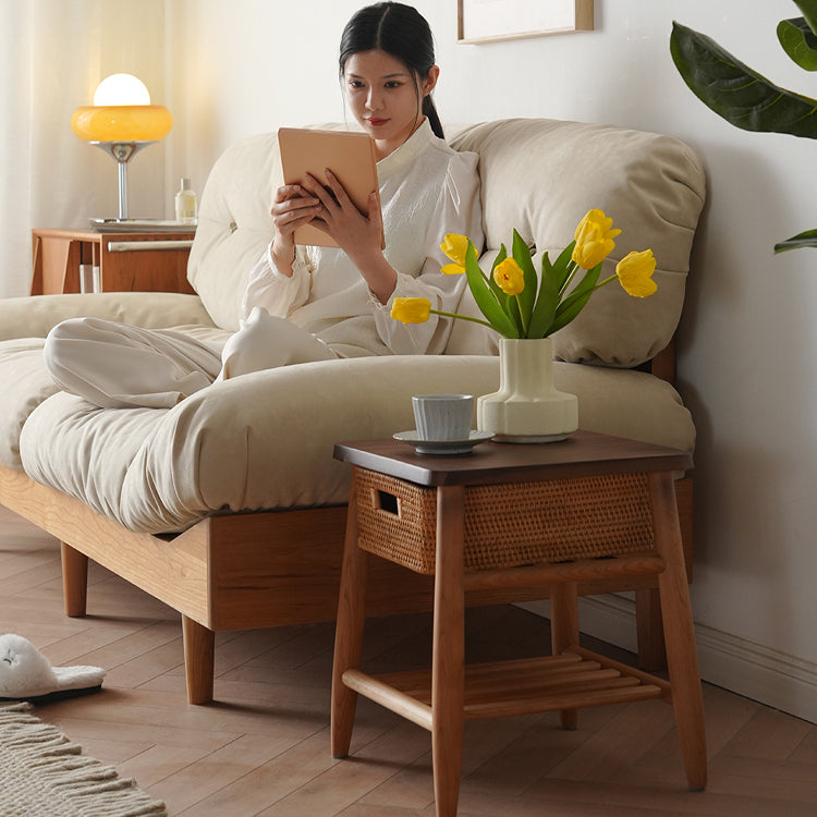 天然木の温かみと職人技が光るサイドテーブルです。ラタン材を使用した引き出しは収納力があり、リモコンや雑誌などの小物をすっきり整理できます。コンパクトなサイズ感でソファやベッドサイドに最適。実用性とナチュラルな魅力を兼ね備えた、日常に寄り添う家具です。
