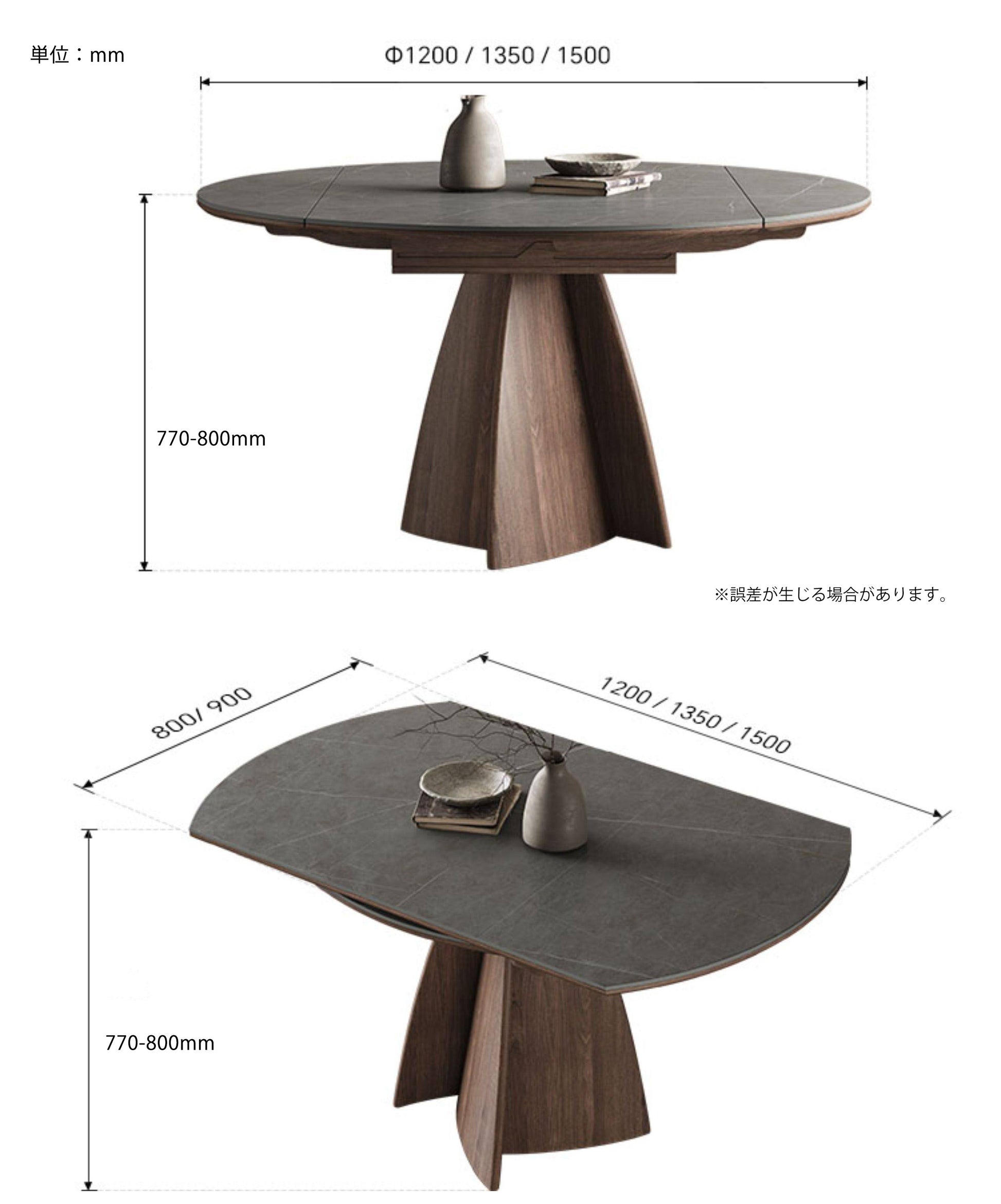 この伸縮式ダイニングテーブルは、円形セラミック天板と無垢材脚が特徴です。天板は丈夫でお手入れも簡単で、脚はしっかりとした支持力を発揮します。コンパクトに収納できるので、小さなダイニングスペースでも使いやすいです。