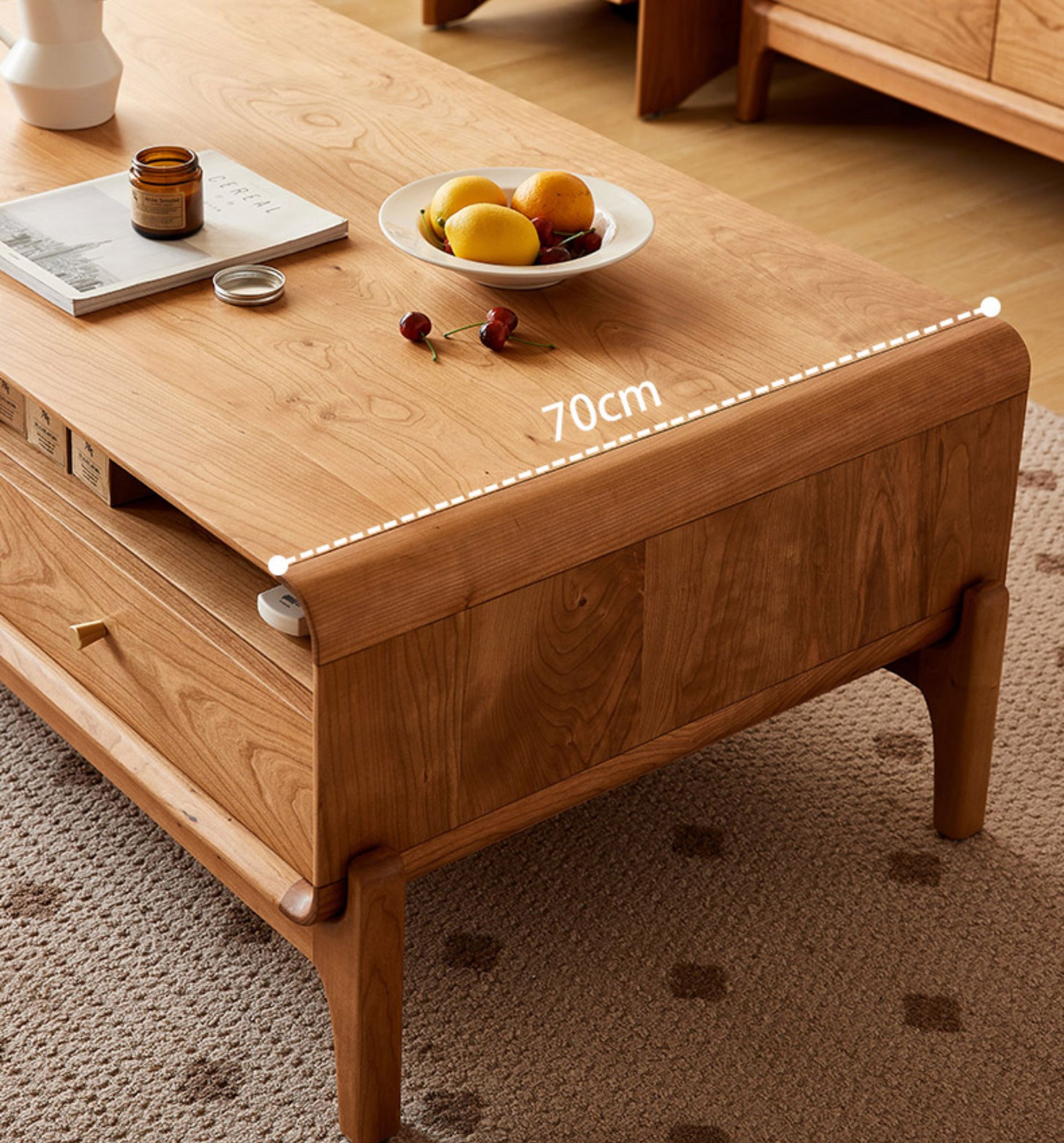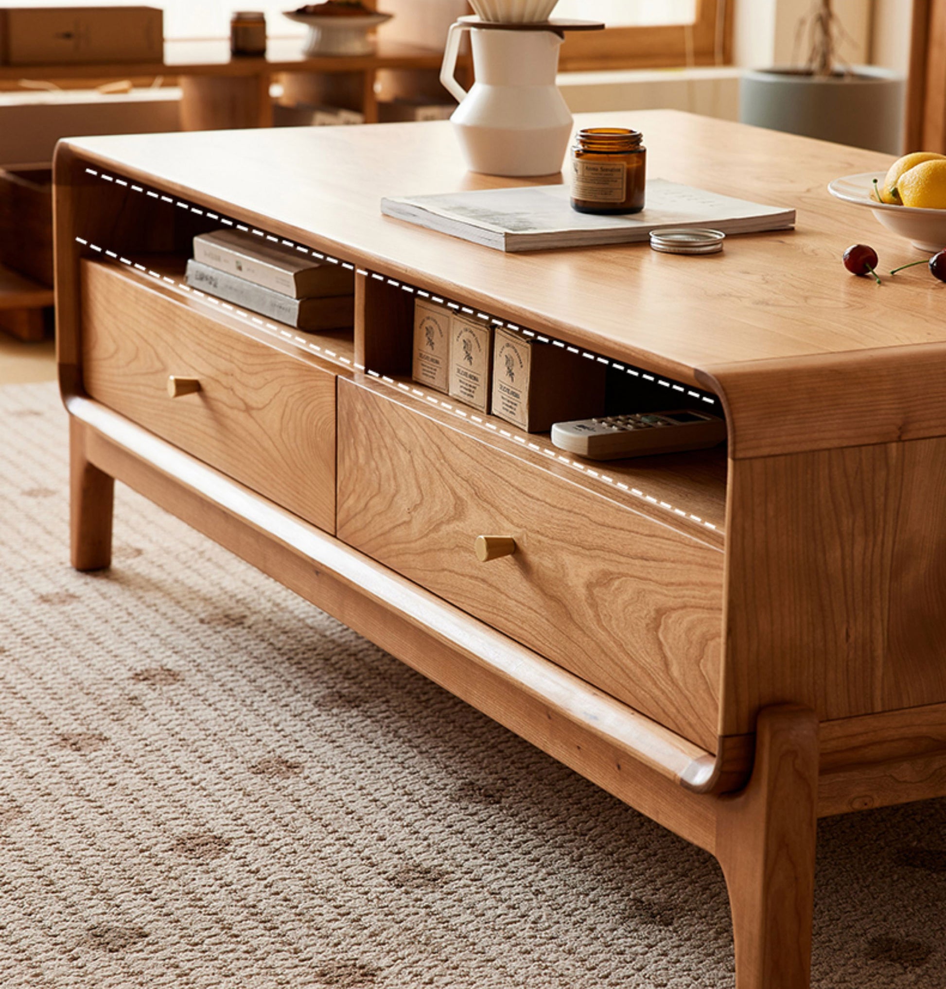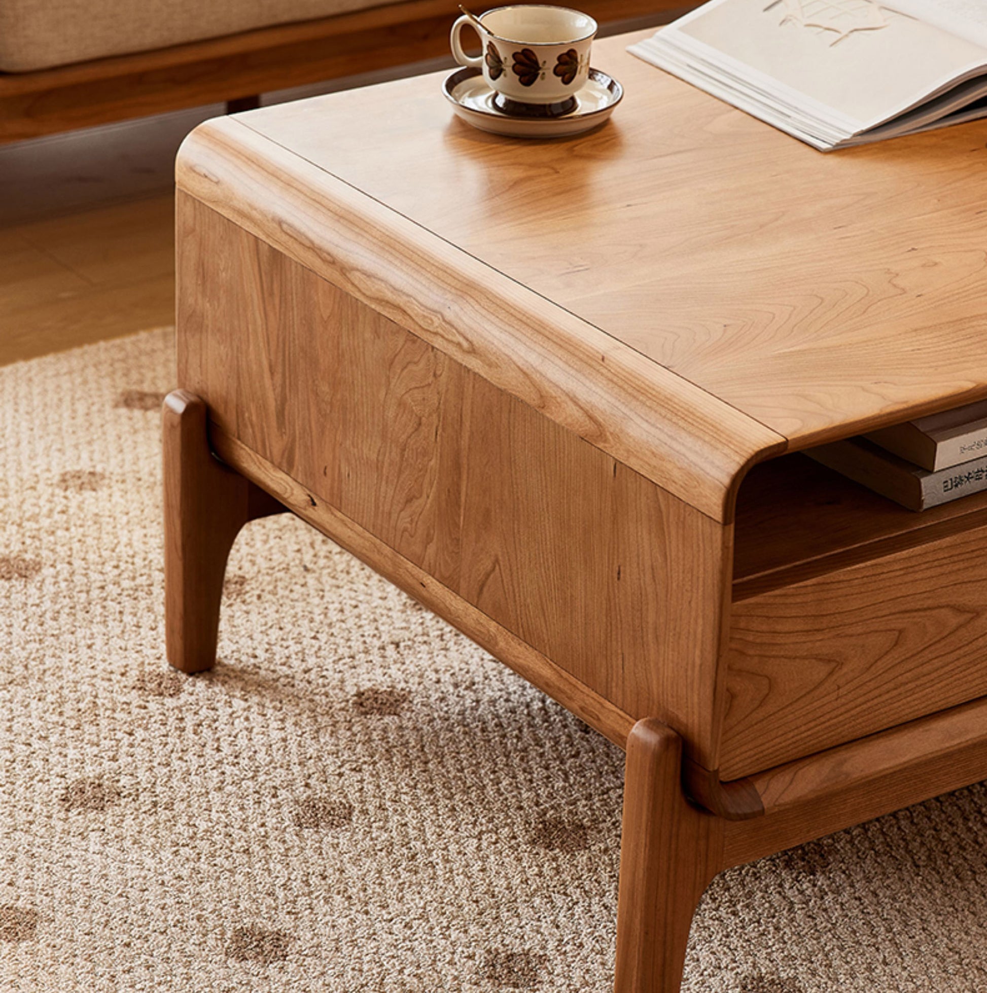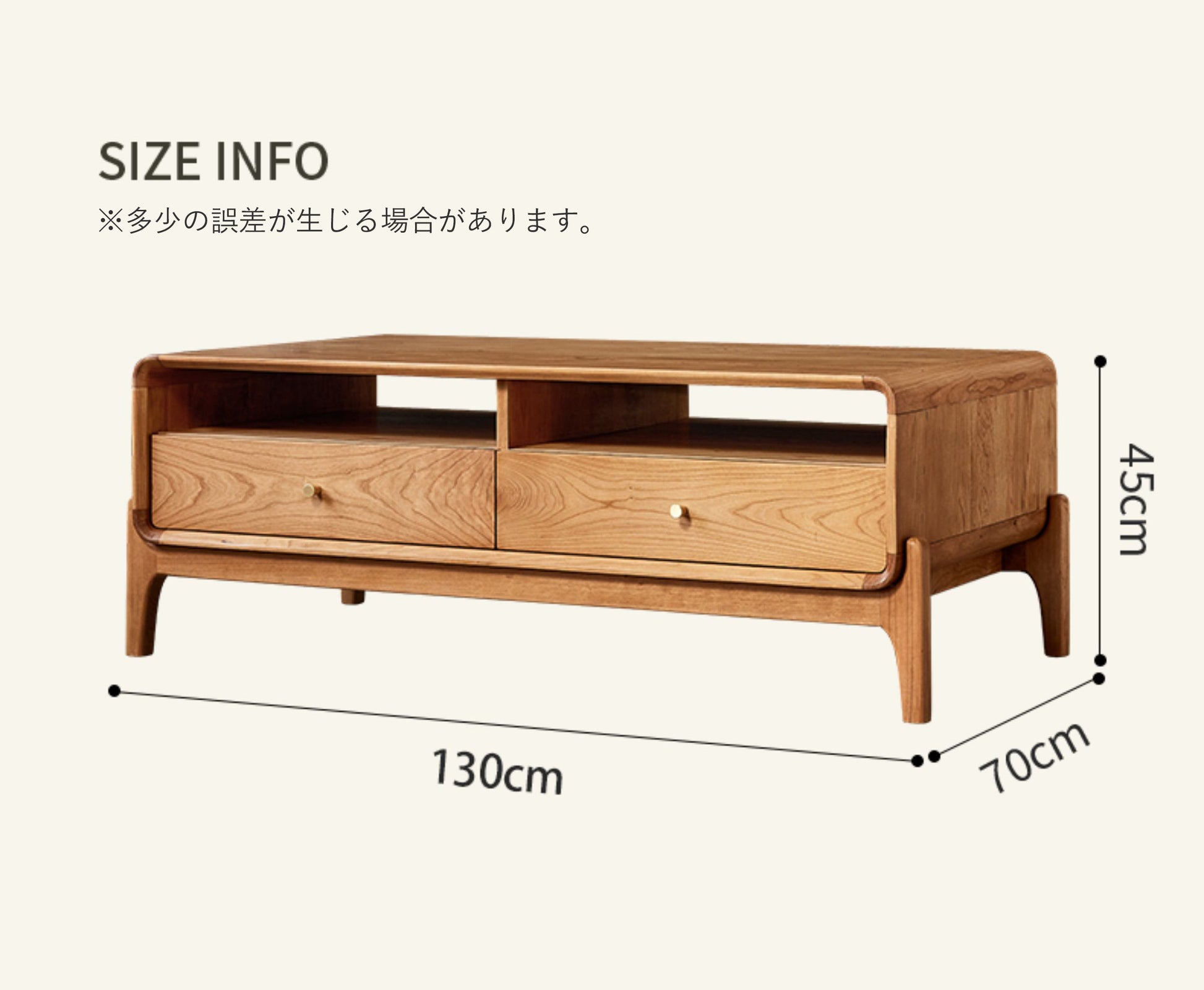 チェリー材の無垢素材を使用したリビング用ローテーブルです。引き出し付き収納ボードが備わり、抜群の収納力でリビングの整理整頓に最適。経年変化で風合いが深まり、長く愛用できるデザインと品質を兼ね備えています。実用性と美しさを両立した高機能なコーヒーテーブルです。