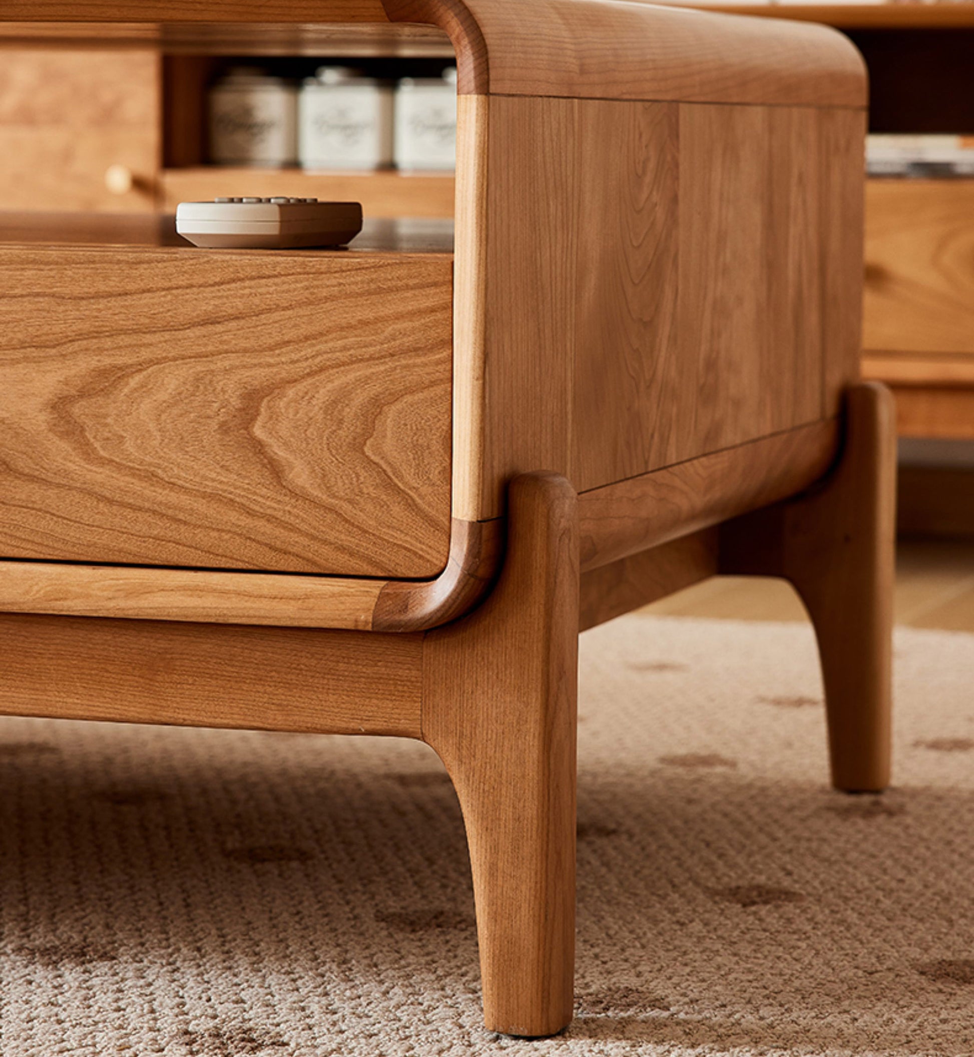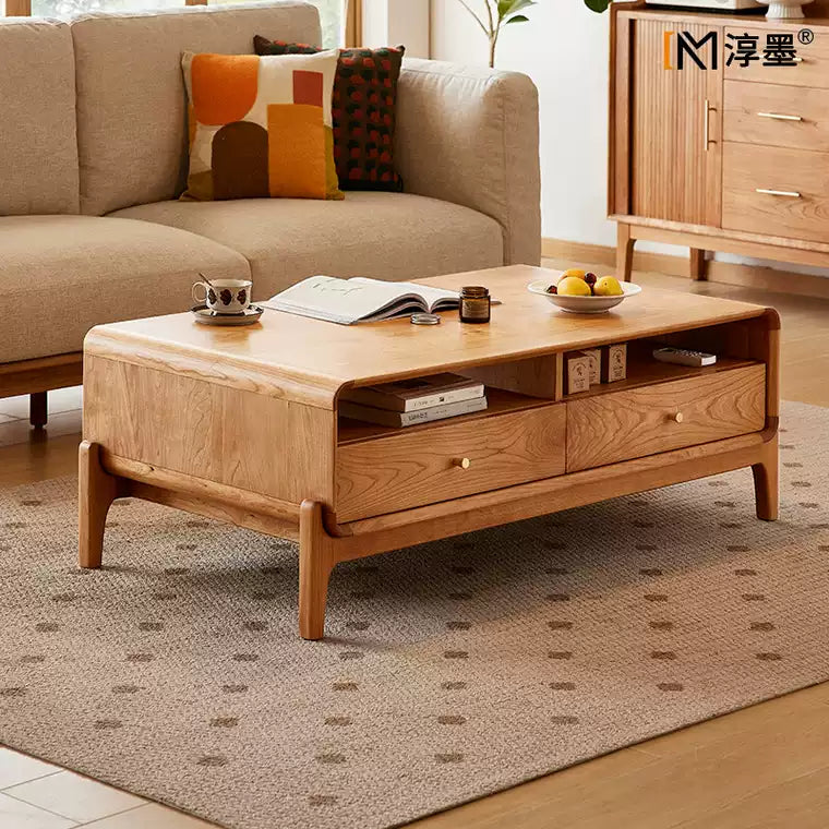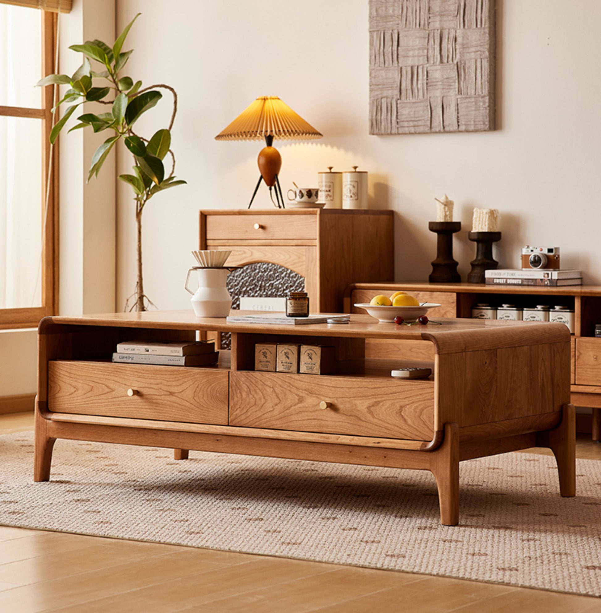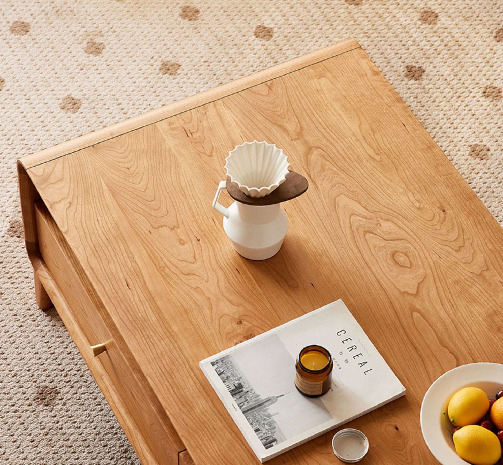 チェリー材の無垢素材を使用したリビング用ローテーブルです。引き出し付き収納ボードが備わり、抜群の収納力でリビングの整理整頓に最適。経年変化で風合いが深まり、長く愛用できるデザインと品質を兼ね備えています。実用性と美しさを両立した高機能なコーヒーテーブルです。