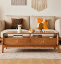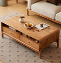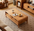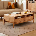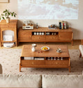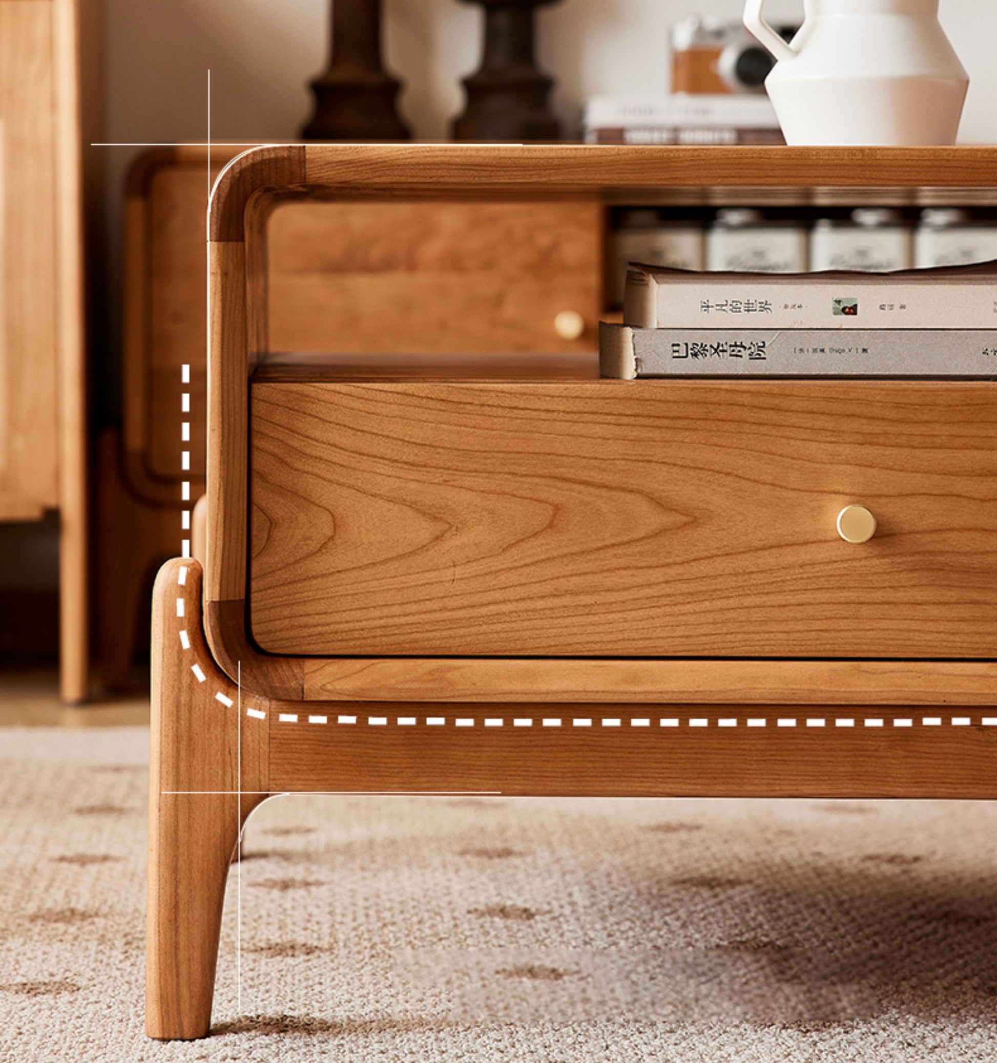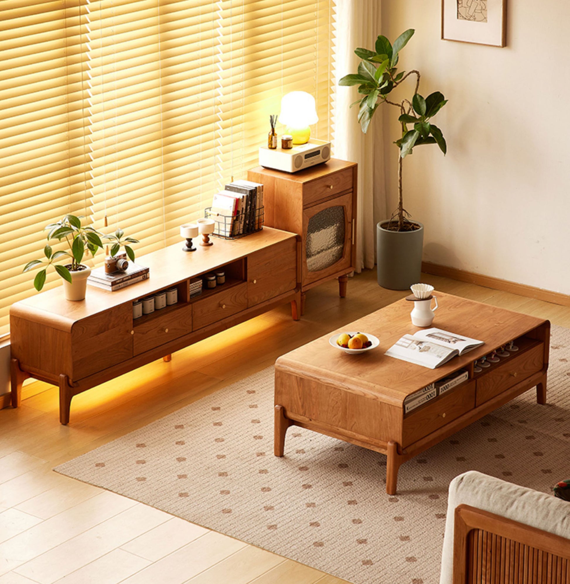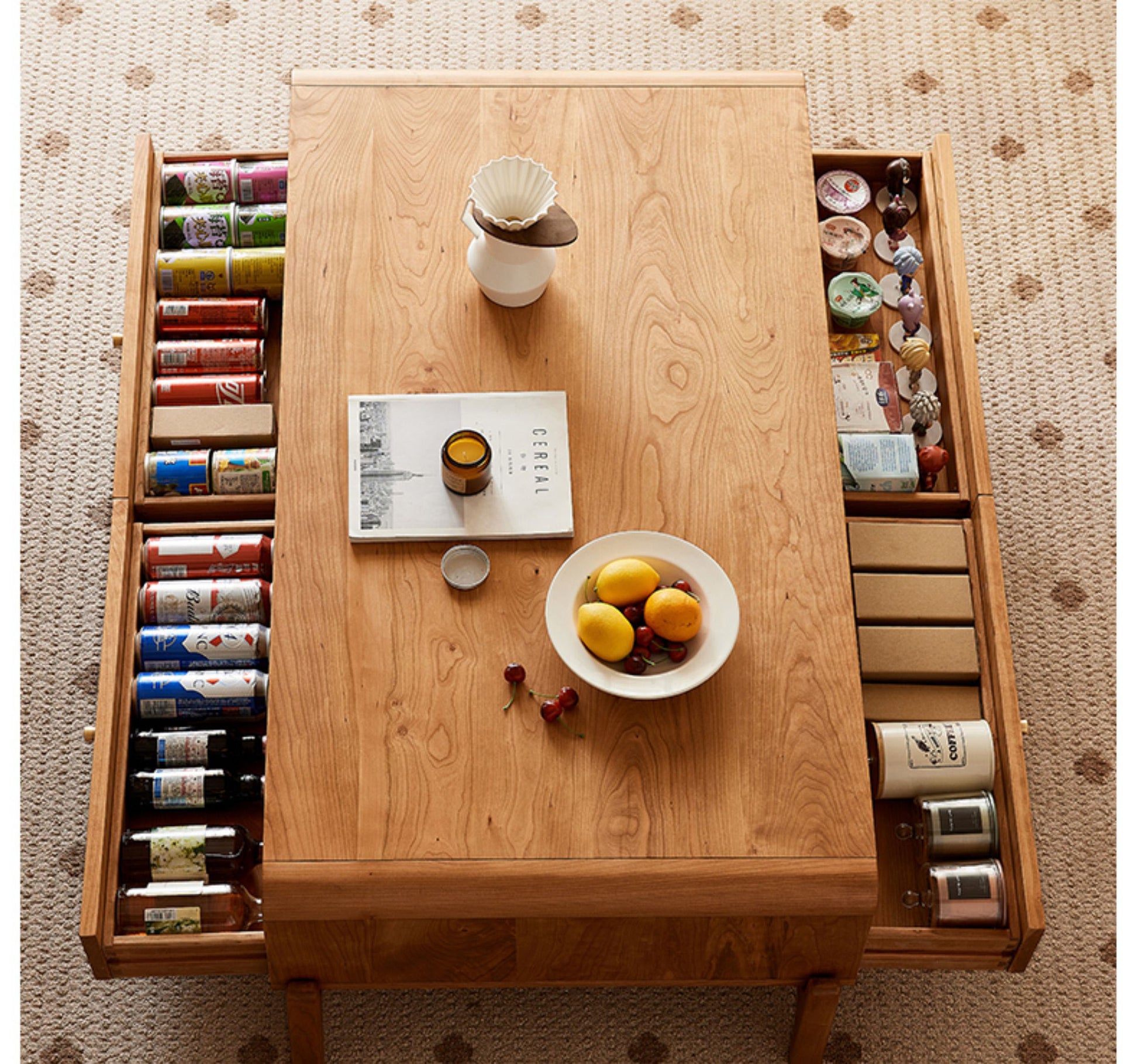 チェリー材の無垢素材を使用したリビング用ローテーブルです。引き出し付き収納ボードが備わり、抜群の収納力でリビングの整理整頓に最適。経年変化で風合いが深まり、長く愛用できるデザインと品質を兼ね備えています。実用性と美しさを両立した高機能なコーヒーテーブルです。