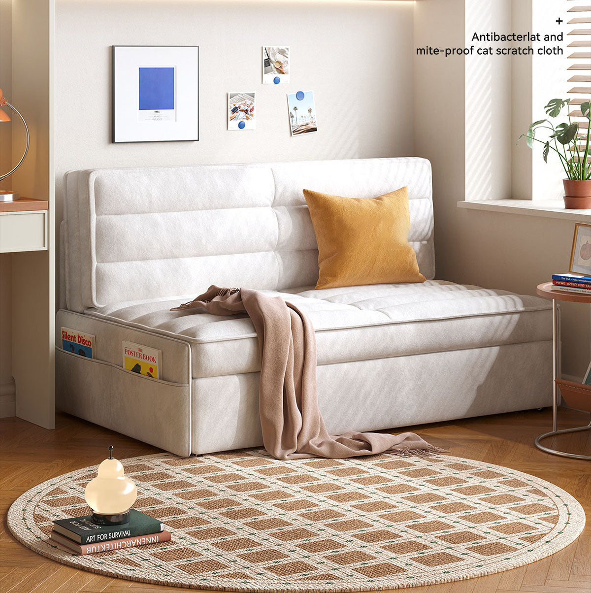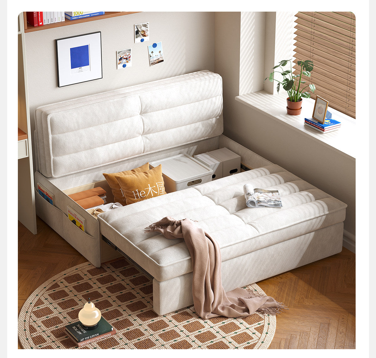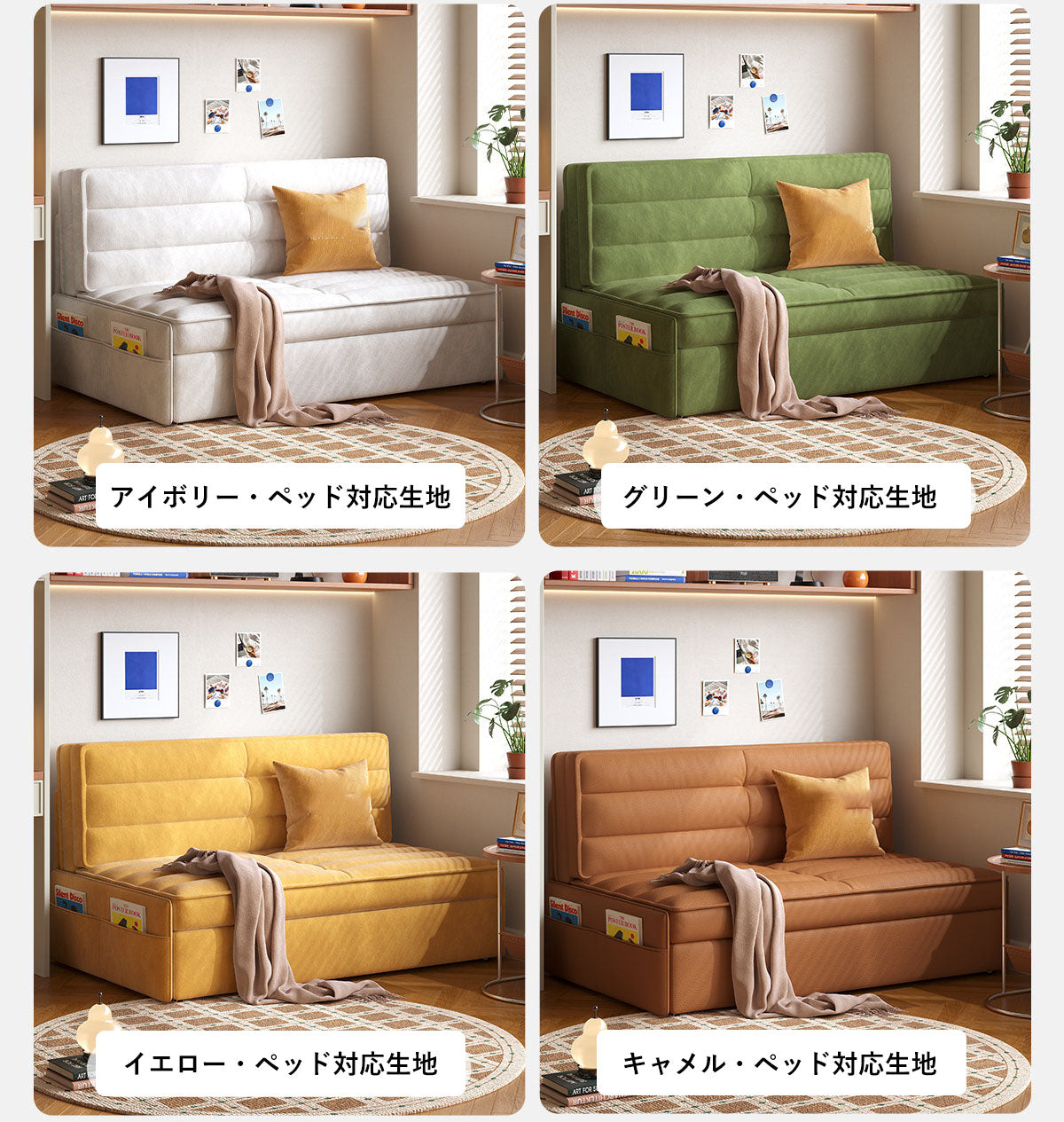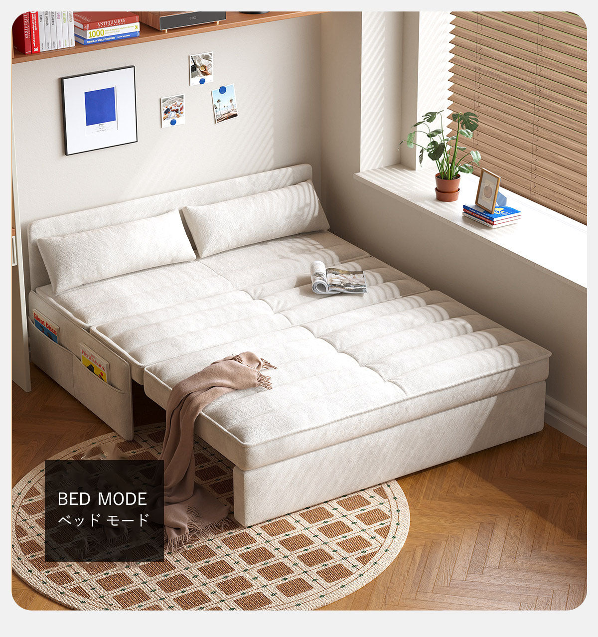 ソファ、ベッド、カウチーの3つの使い方ができる多機能家具です。普段はコンパクトなソファとして、来客時には素早くベッドに変身。軽量設計で操作も簡単なので、毎日のスタイルチェンジも楽々です。下部の引き出し収納で季節物や寝具もスッキリ片付き、生活感を感じさせないスマートなデザイン。限られたお部屋を最大限に活用したい方、急な来客にも対応したい方の強い味方です。
