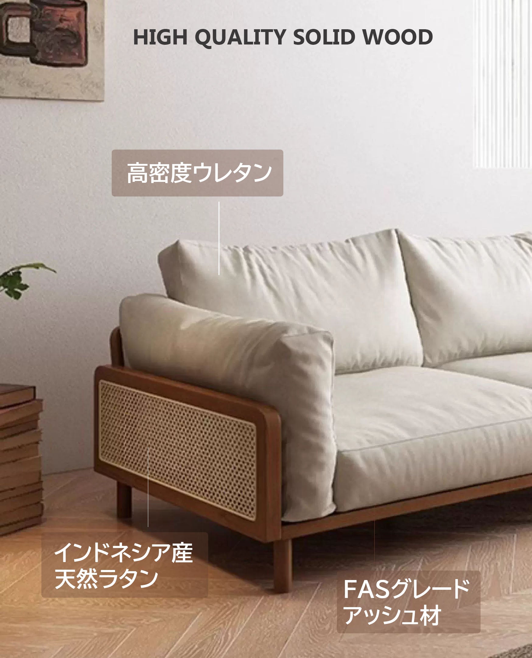 北欧風の無垢材とラタンを組み合わせたテクノロジーファブリック製の3人掛けストレートソファです。シンプルでモダンなデザインは、小さなアパートやログスタイルのリビングルームに最適。耐久性の高い素材と快適な座り心地を両立し、長く愛用できる一台です。