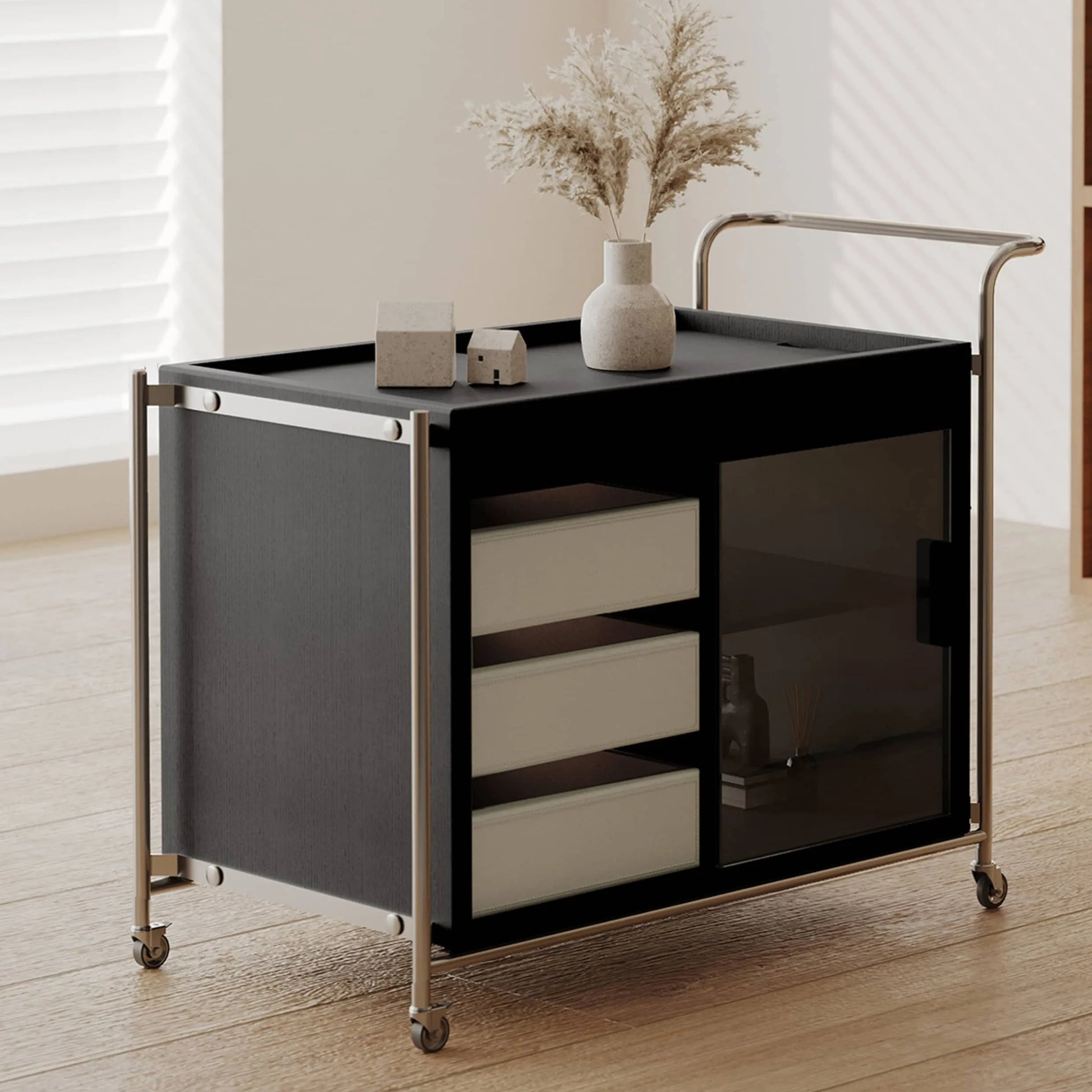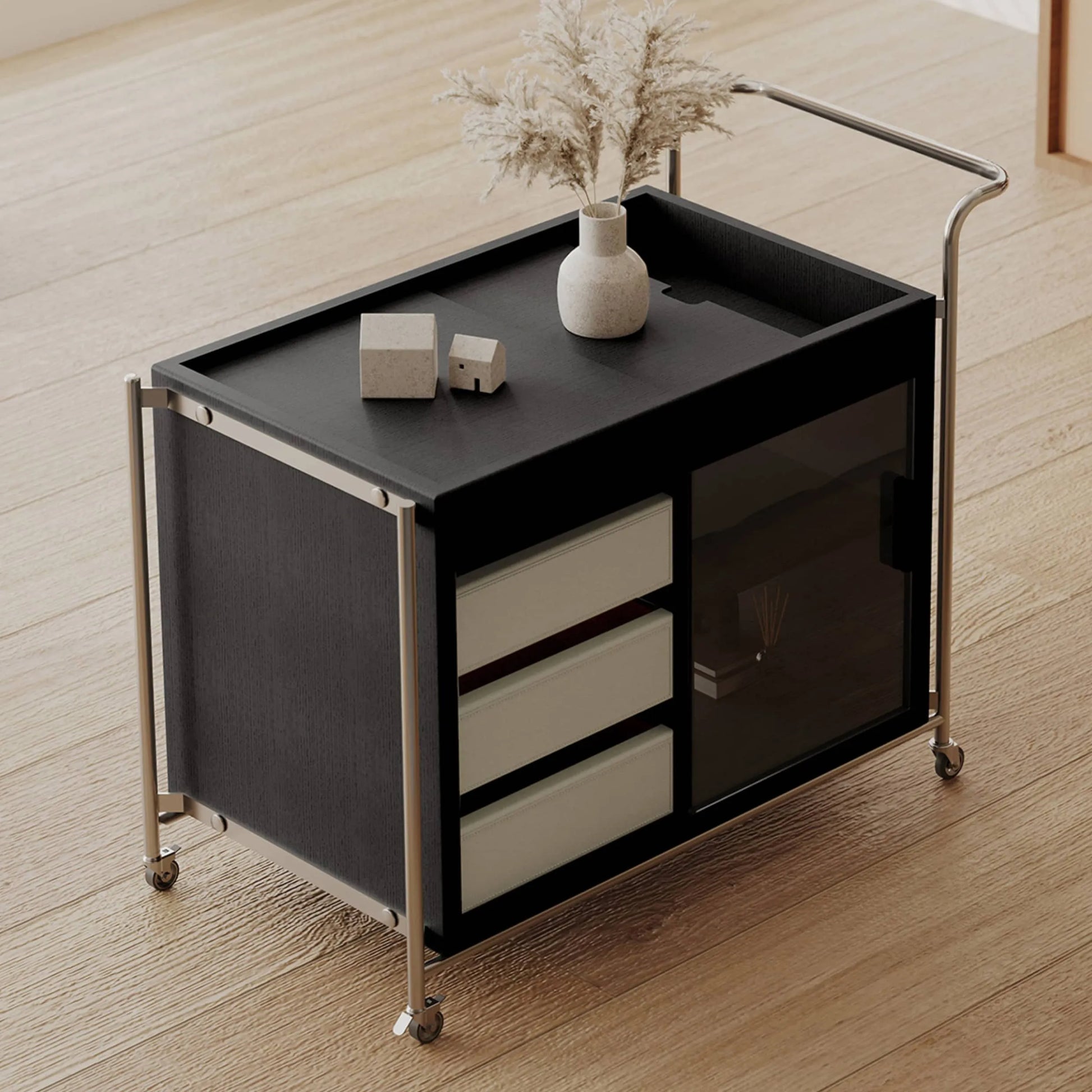 洗練されたステンレス鋼フレームが特徴のモダンカートです。強化ガラス天板は傷に強く、清潔感のある空間を演出します。合成皮革のハンドルは握りやすく、耐久性に優れています。シンプルながら高級感のあるデザインは、リビングやベッドルーム、オフィスなど様々な場所に調和します。機能性とスタイルを兼ね備えた、毎日の生活をより快適にするアイテムです。