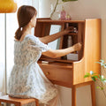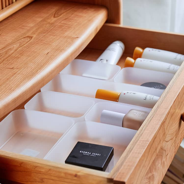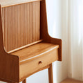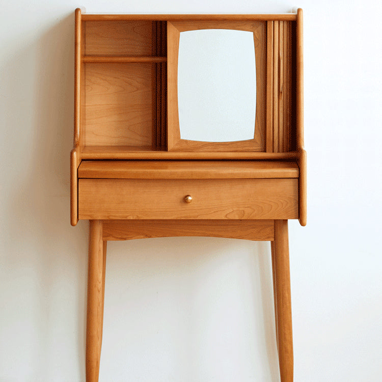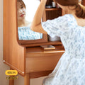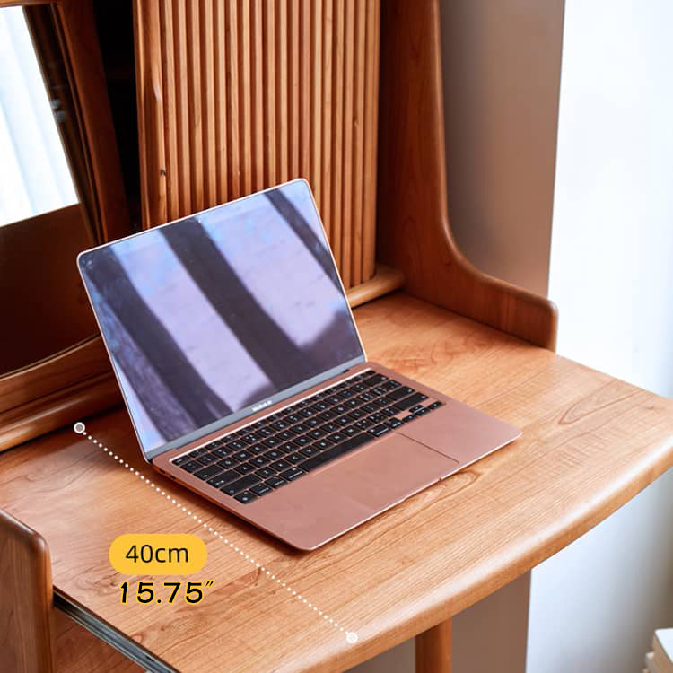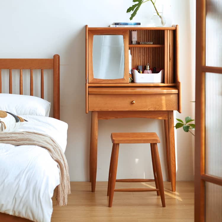 毎日のメイクタイムを特別な時間に変える高級チェリー材の化粧台です。多層板構造による安定性と耐久性を備え、銅の取っ手とゴールドのアクセントが上品さを演出します。お手入れが簡単なガラス天板と美しい鏡面、コンパクトながら収納力抜群のデザインで、限られたスペースでも機能性と美しさを両立。あなたのライフスタイルに寄り添う、長く愛用できる逸品です。