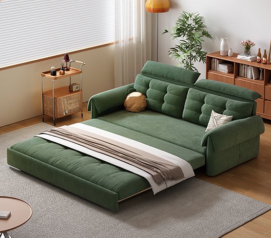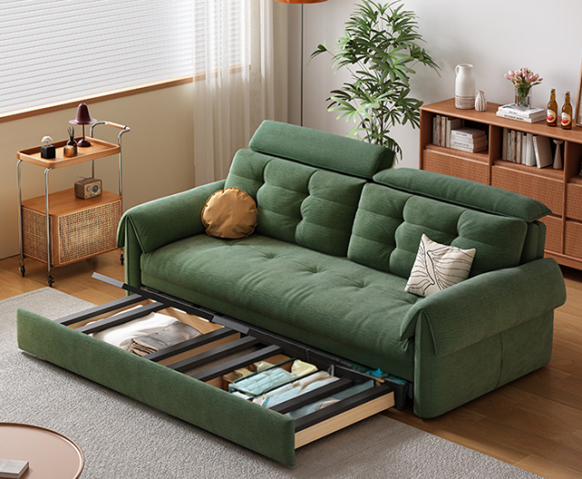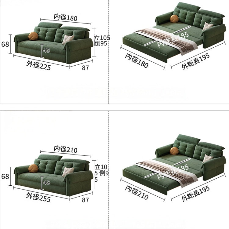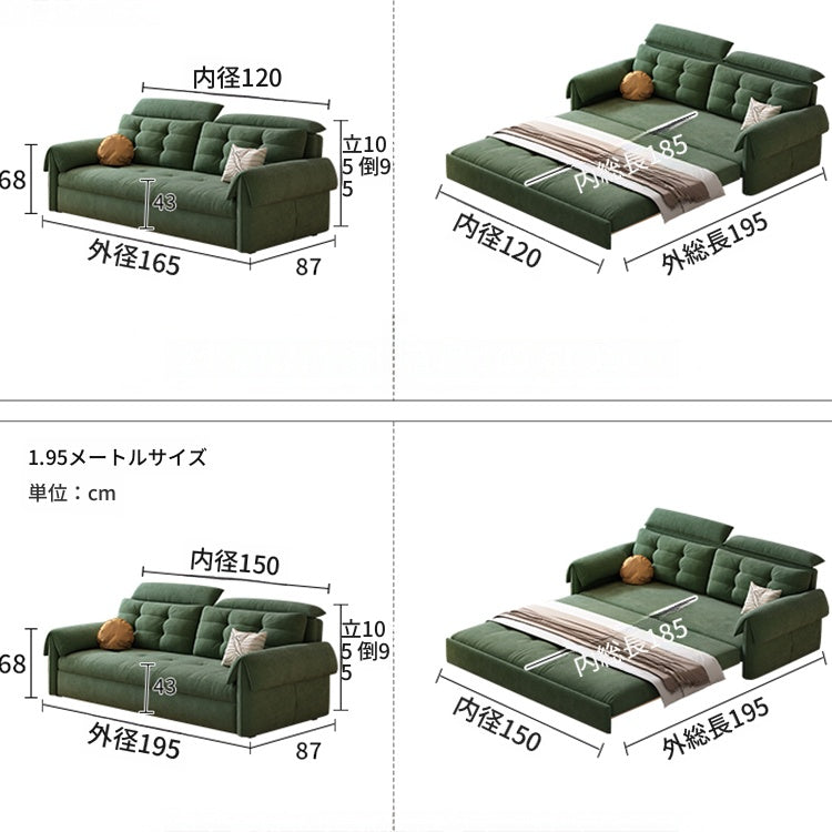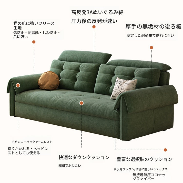 幅145cmから255cmまで選べる2人掛けから4人掛けまで対応可能なソファーベッドです。収納スペース付きでワンルームに最適。ウレタン座面とパイル生地が快適な座り心地を提供し、シリコンフィルと無垢材を使用した丈夫な作りです。来客時にはベッドとしても使える2way仕様で、グリーンカラーがお部屋に落ち着きをプラスします。使いやすさとデザイン性を両立した多機能ソファーです。