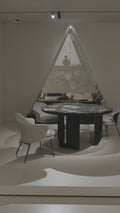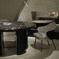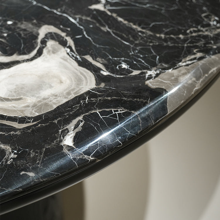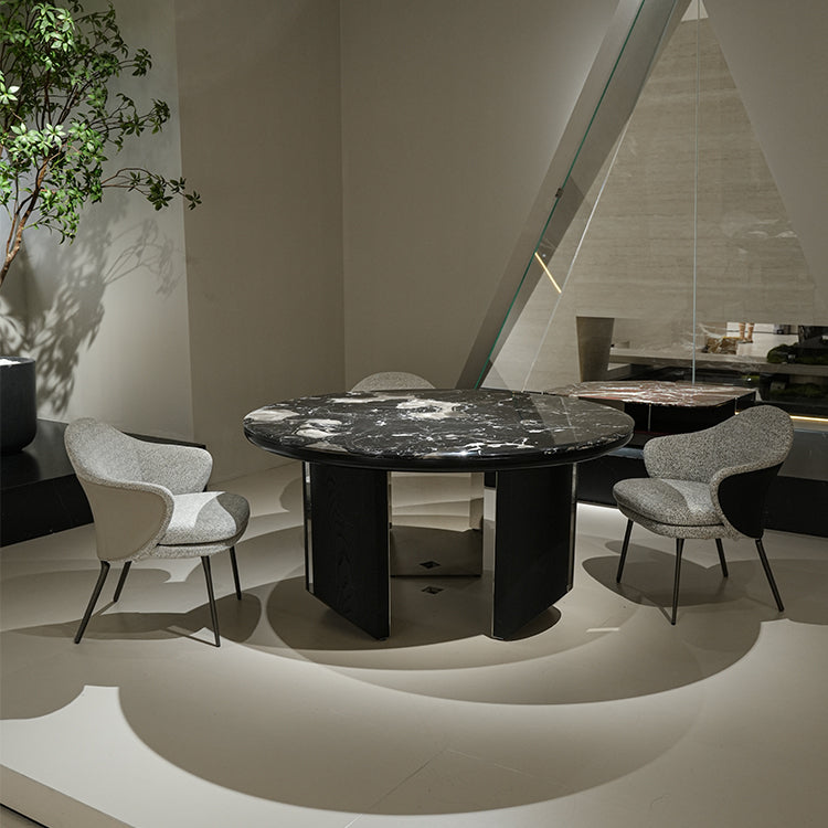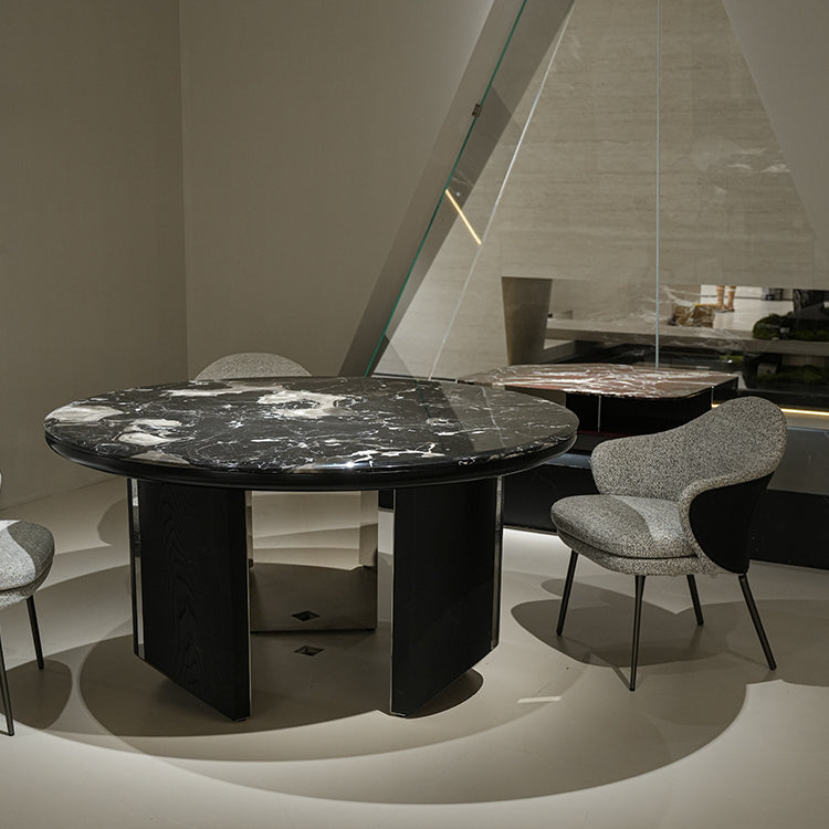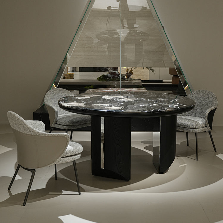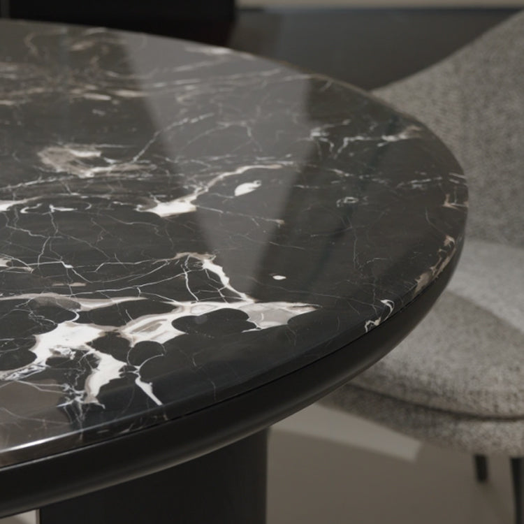 上質なリビングダイニング空間を演出する、天然大理石を使用した円形テーブルです。ホテルライクな洗練された雰囲気を備えた高級輸入家具で、モダンで優雅なインテリアを実現します。ブラックカラーは、どんなお部屋にも馴染みやすく、スタイリッシュな印象を与えます。天然大理石の独特の紋様が、テーブルを一点ものの芸術作品へと昇華させます。家族との食事の時間や、ゲストをおもてなしする際に、このテーブルがあれば、特別な空間が生まれます。