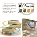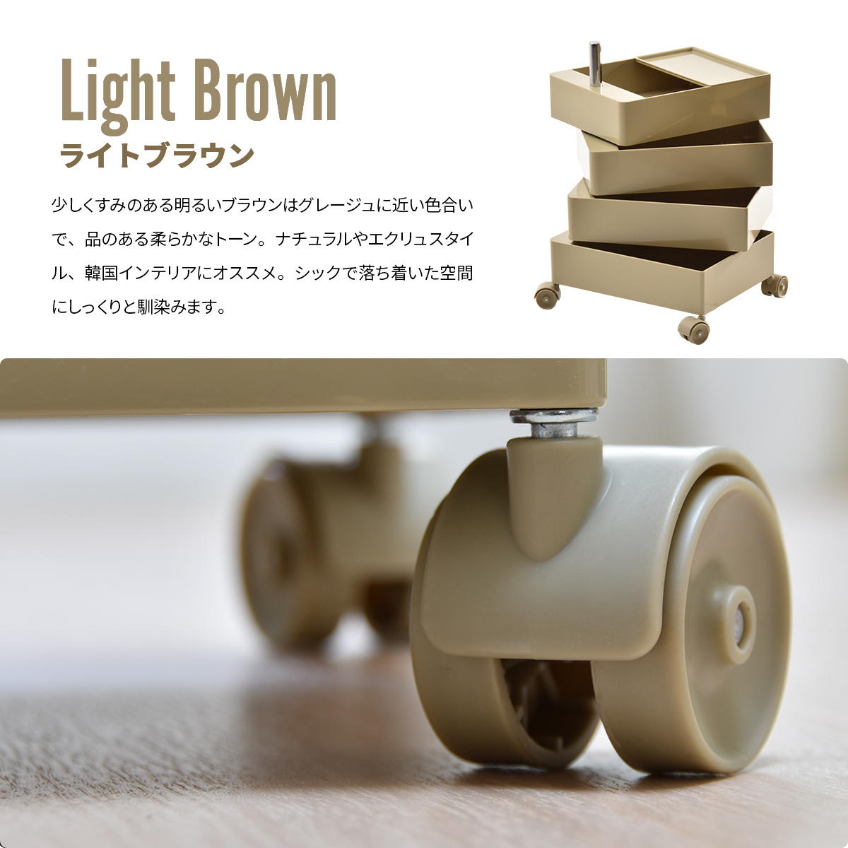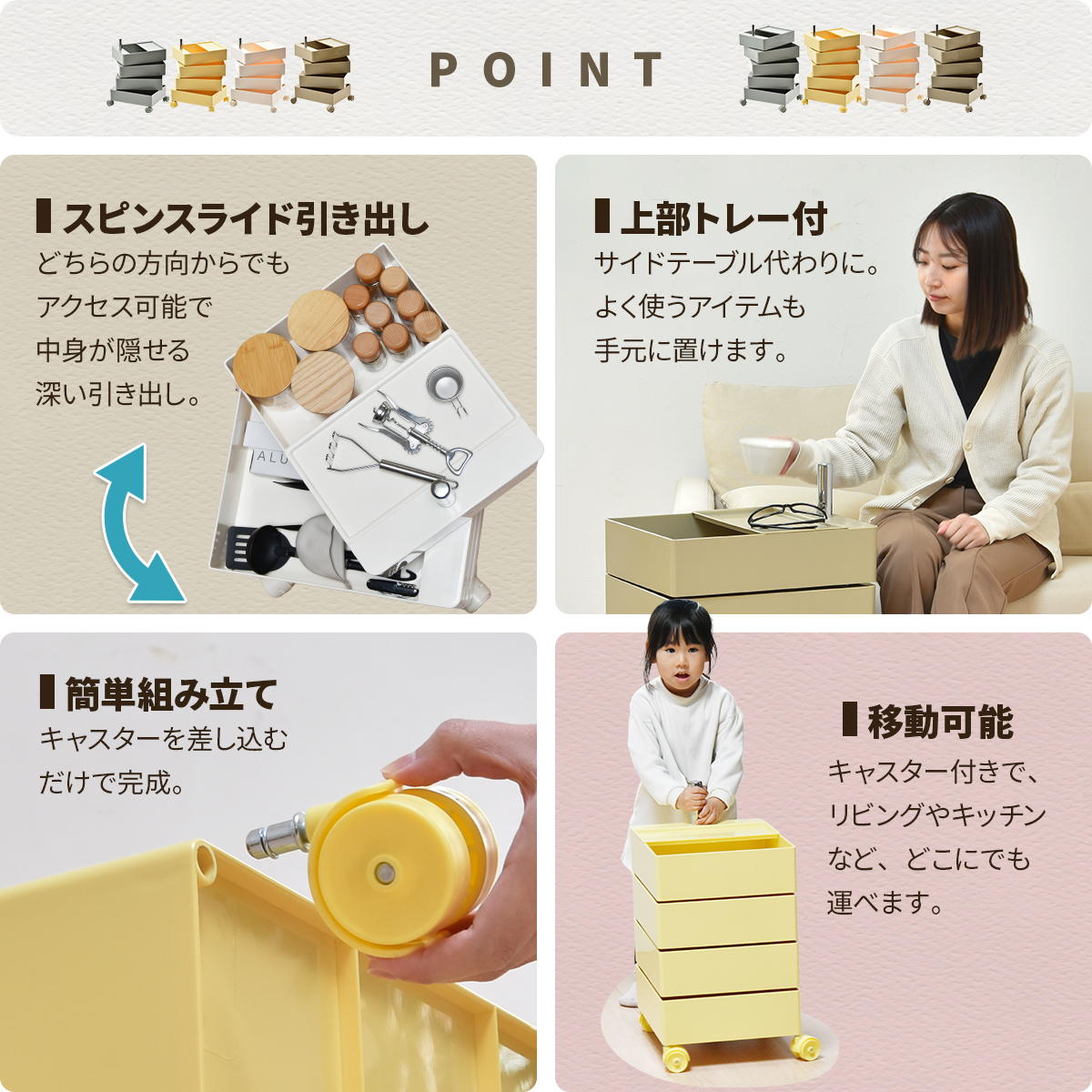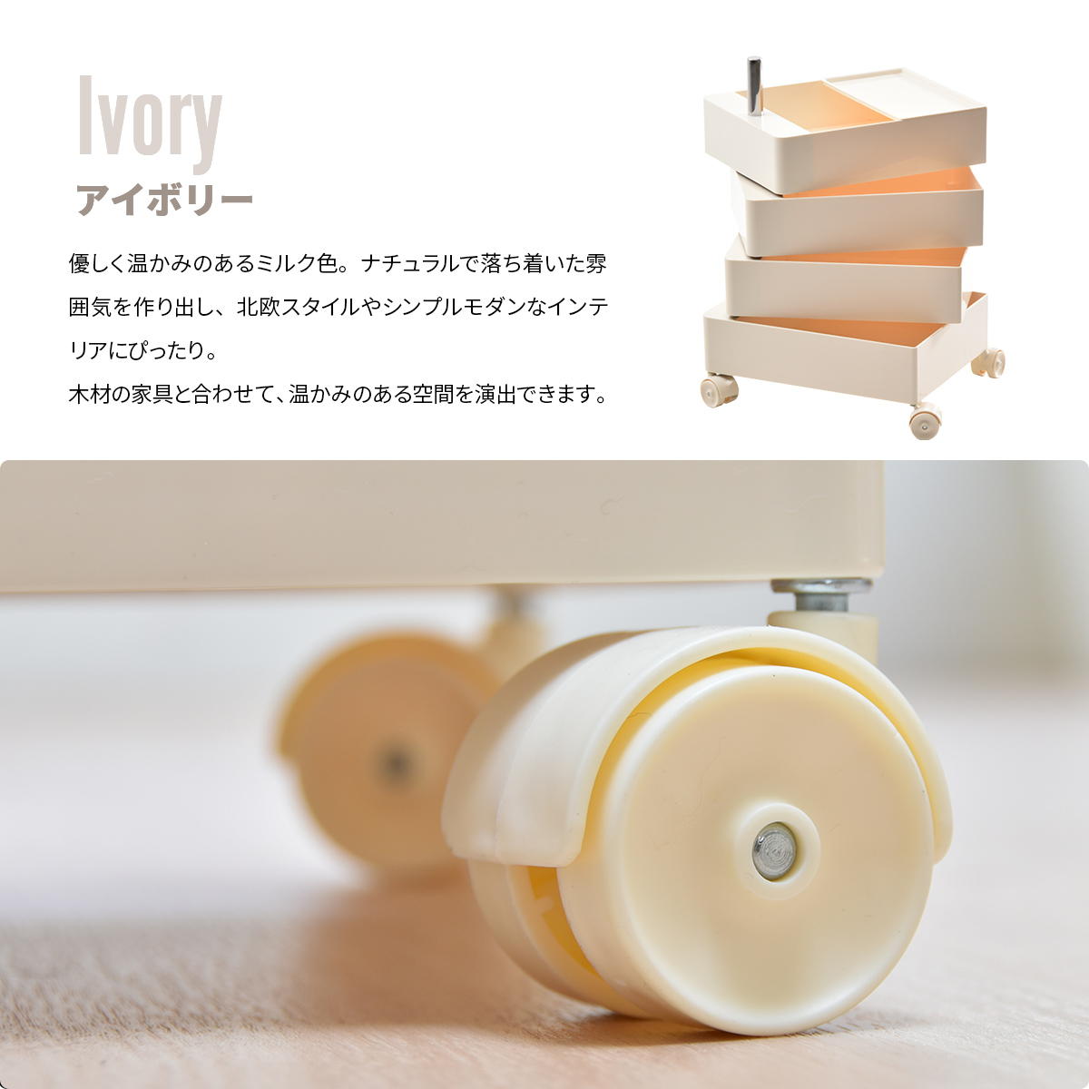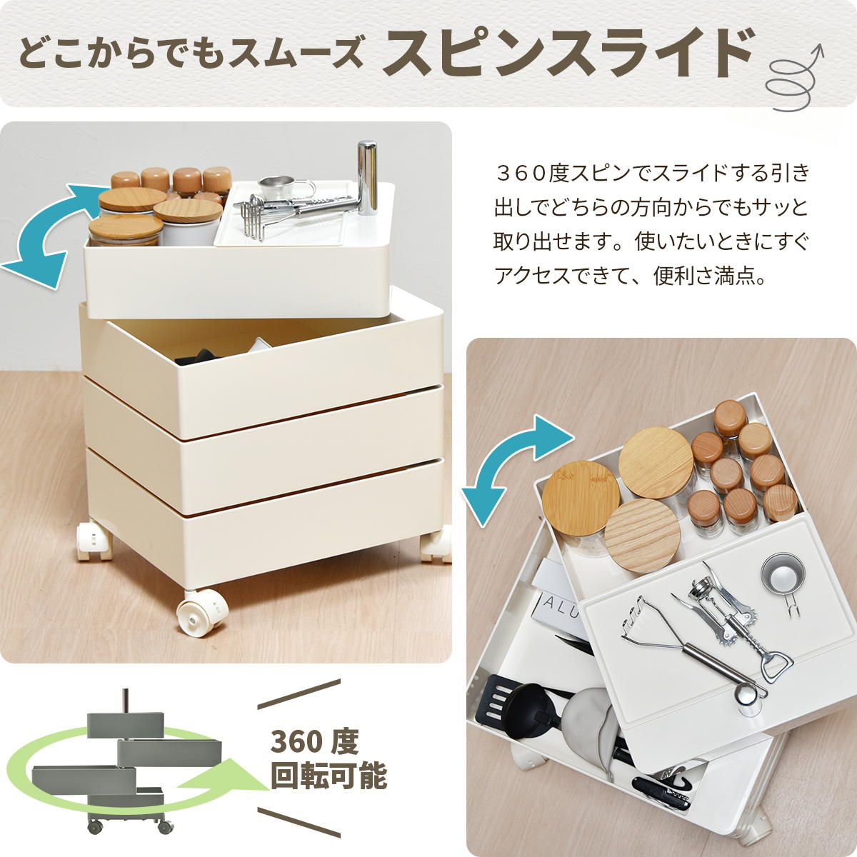 360回転する引出が画期的なワゴンです。引出が色んな角度に開くことができるので、すべての引出を少しづつずらしながら開く事で引出の中身が一気に見渡せて、何がどこに入ってるのか一目瞭然で探す手間が軽減されたり、作業性が上がったりで、便利です。色もアースカラーの色展開でかわいく仕上がっています。