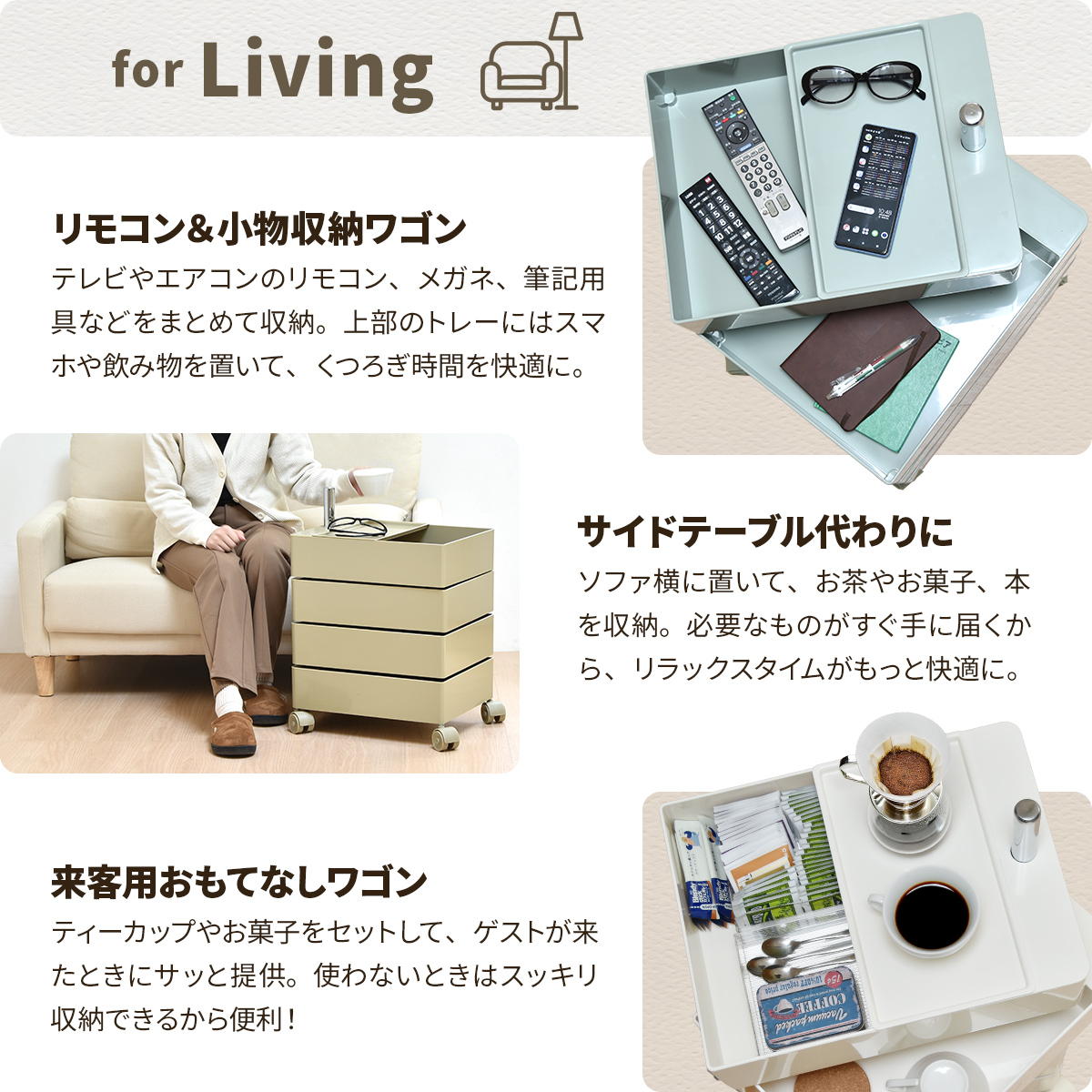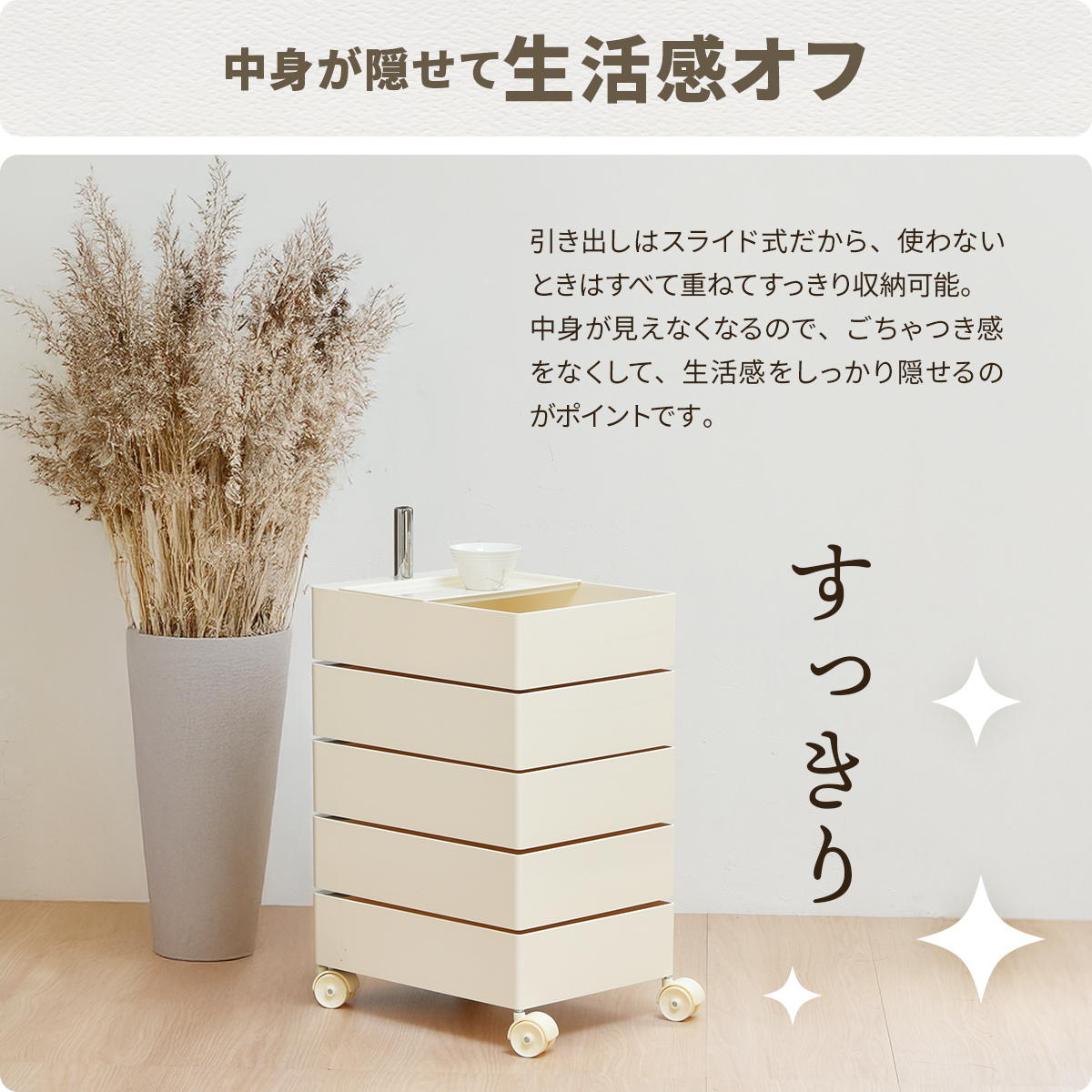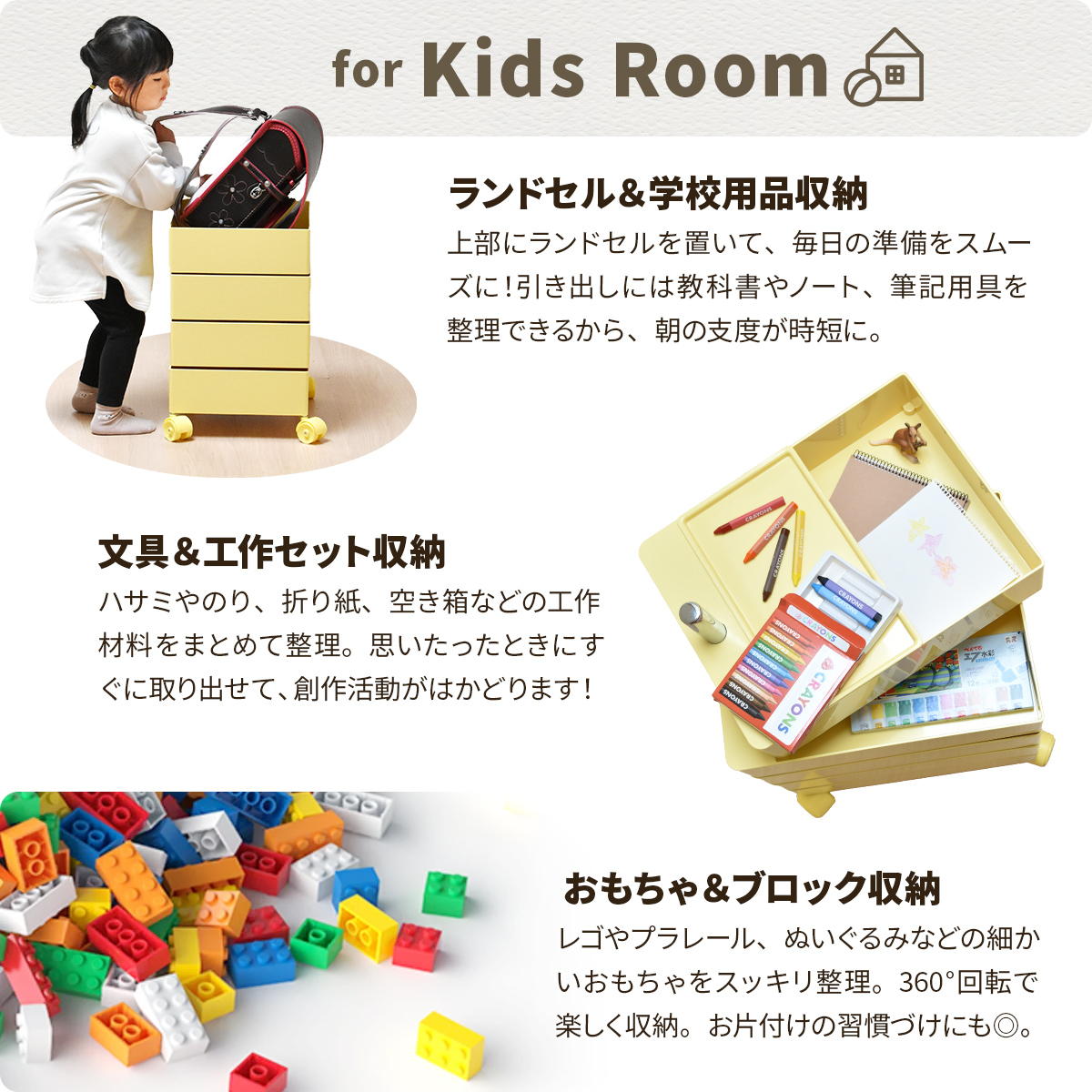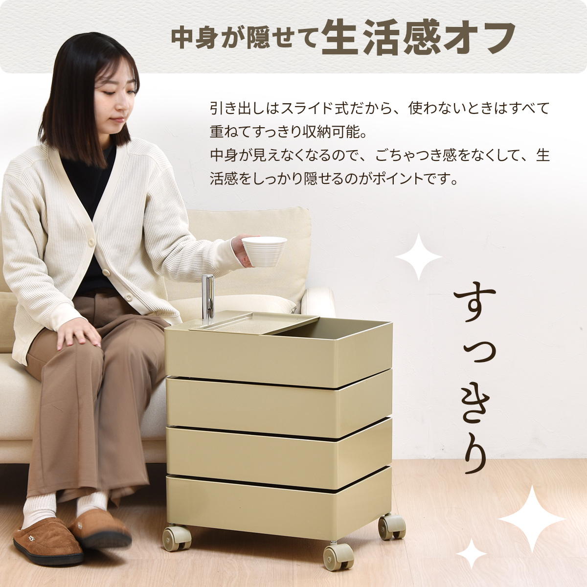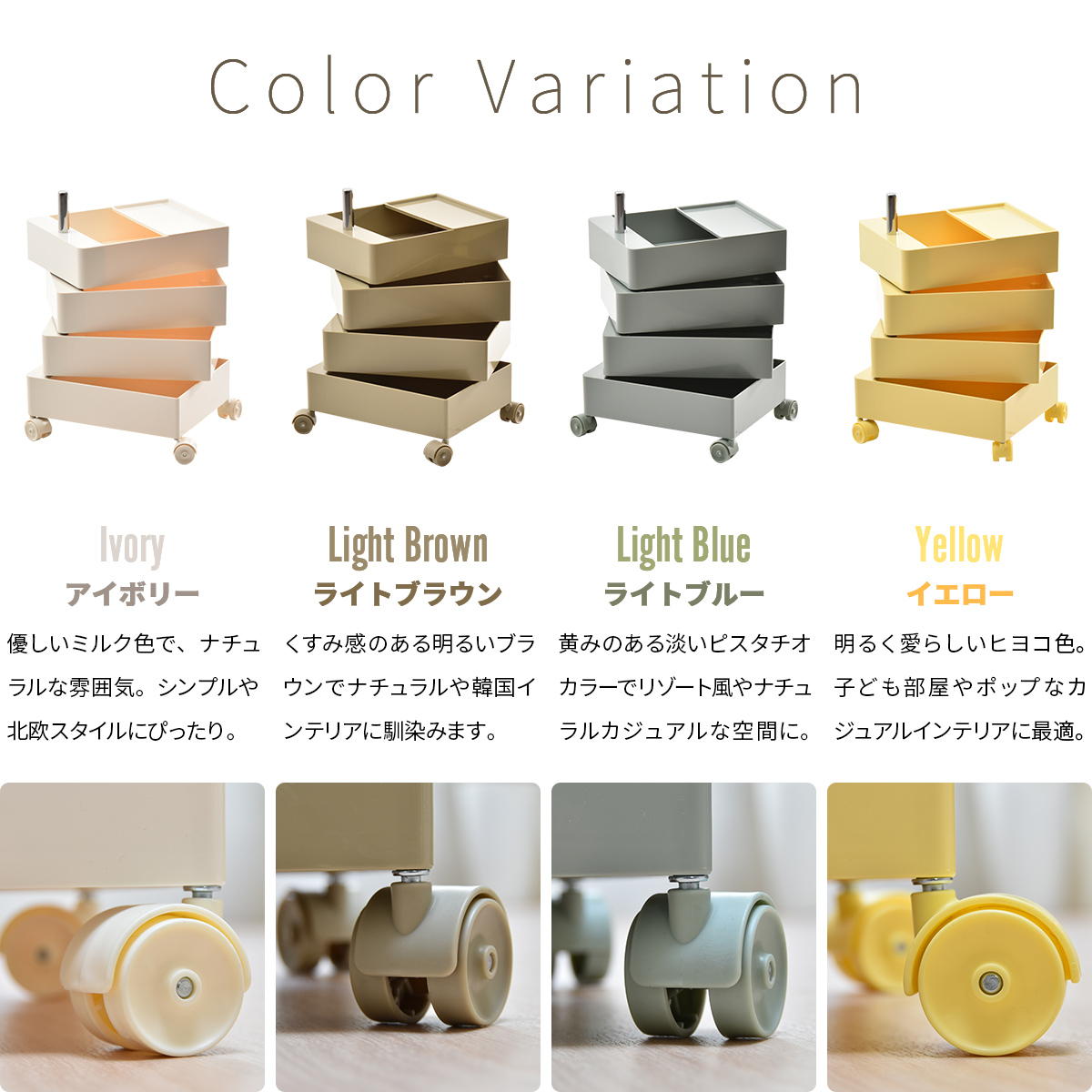 360回転する引出が画期的なワゴンです。引出が色んな角度に開くことができるので、すべての引出を少しづつずらしながら開く事で引出の中身が一気に見渡せて、何がどこに入ってるのか一目瞭然で探す手間が軽減されたり、作業性が上がったりで、便利です。色もアースカラーの色展開でかわいく仕上がっています。