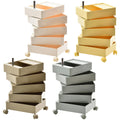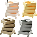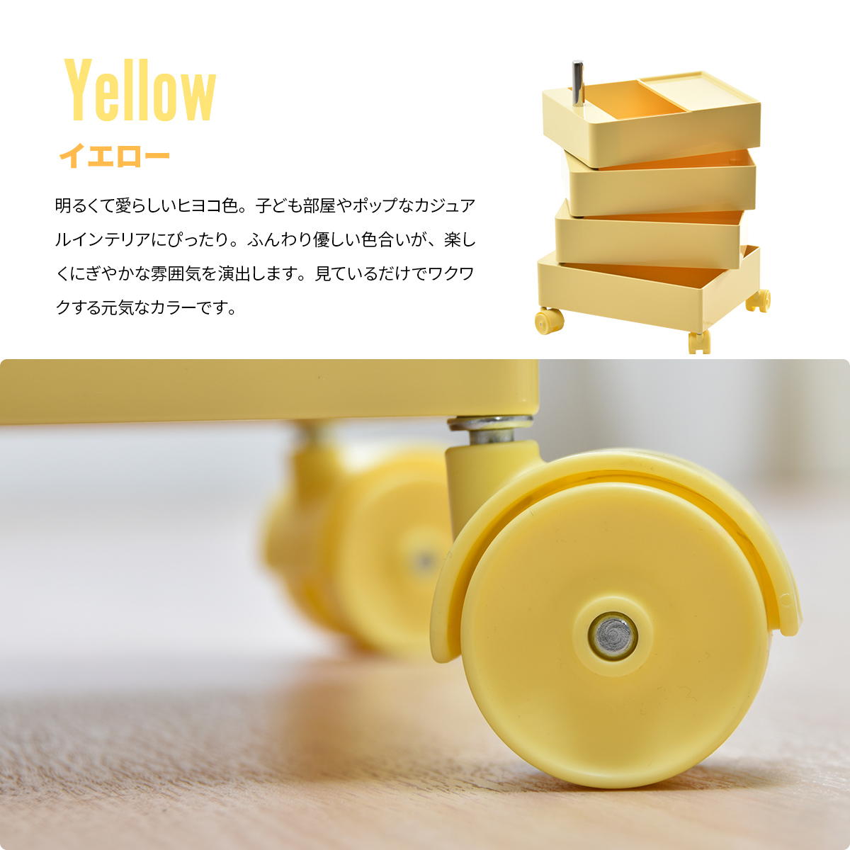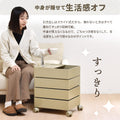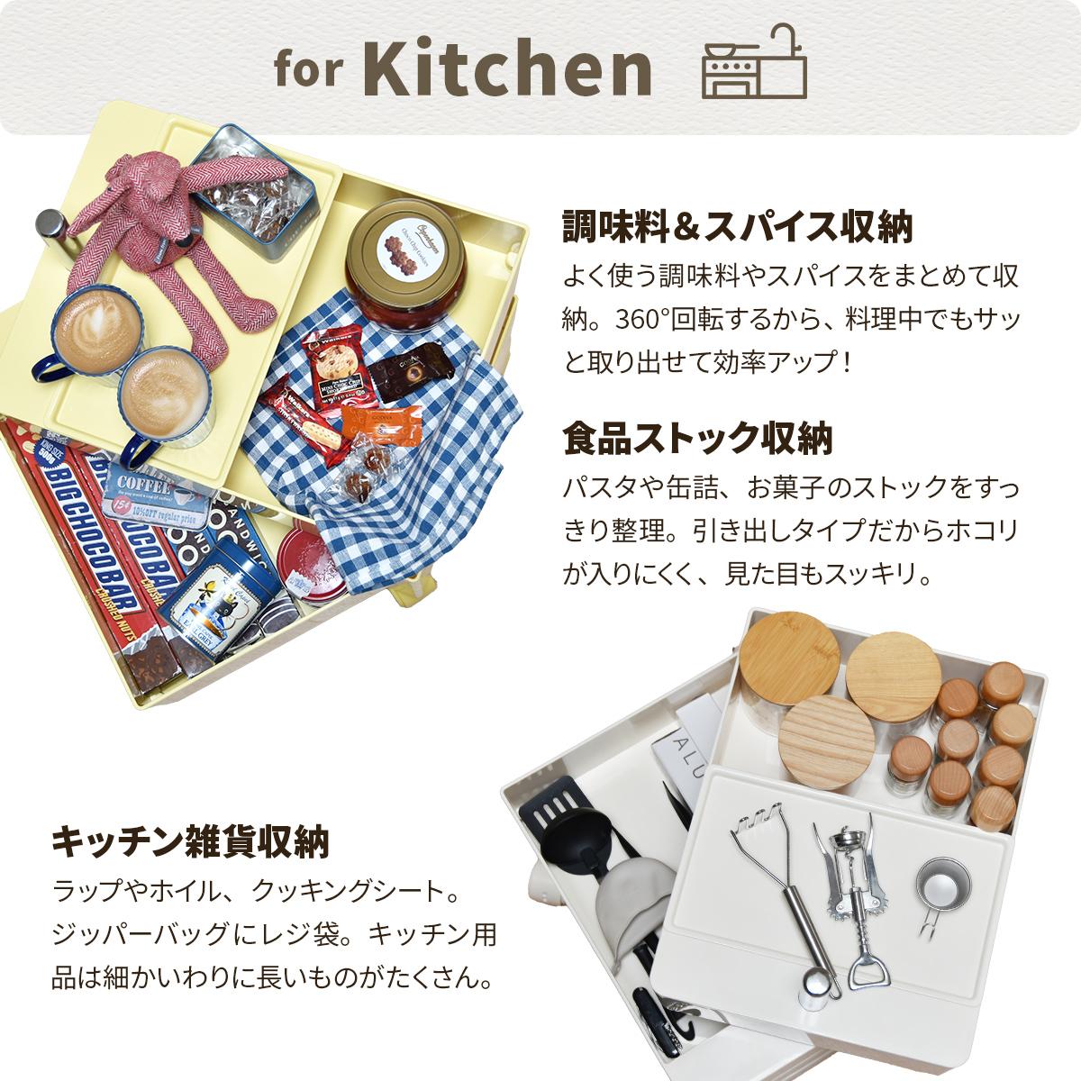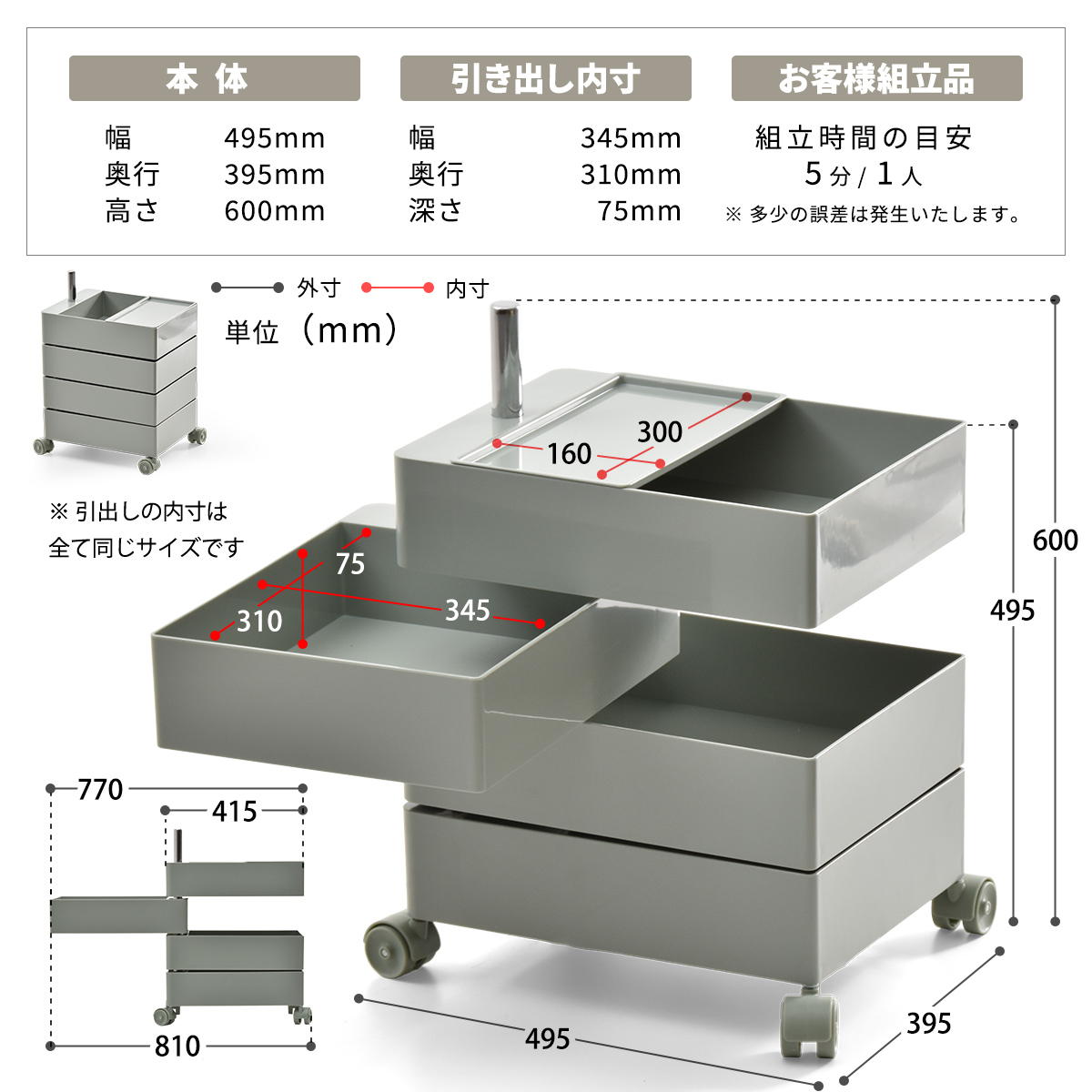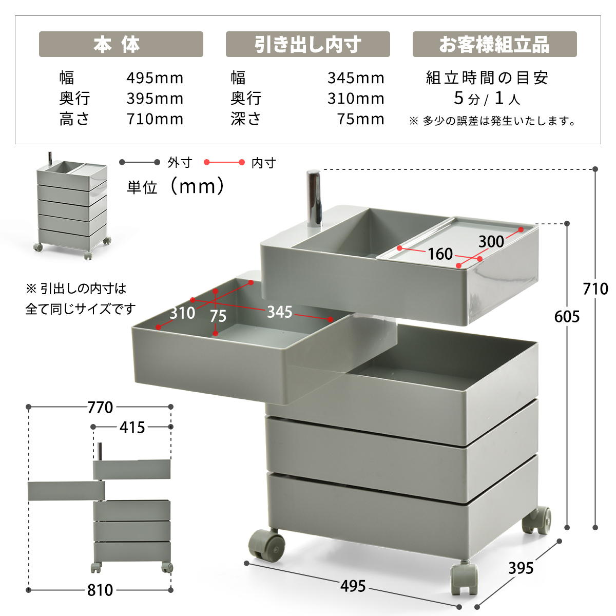 360回転する引出が画期的なワゴンです。引出が色んな角度に開くことができるので、すべての引出を少しづつずらしながら開く事で引出の中身が一気に見渡せて、何がどこに入ってるのか一目瞭然で探す手間が軽減されたり、作業性が上がったりで、便利です。色もアースカラーの色展開でかわいく仕上がっています。