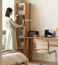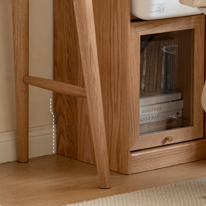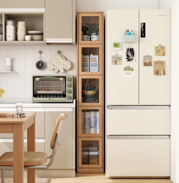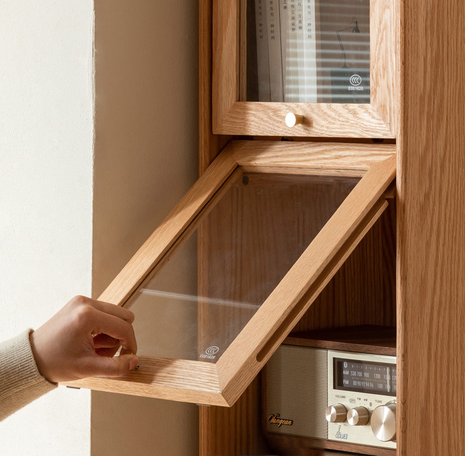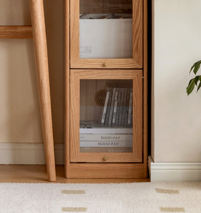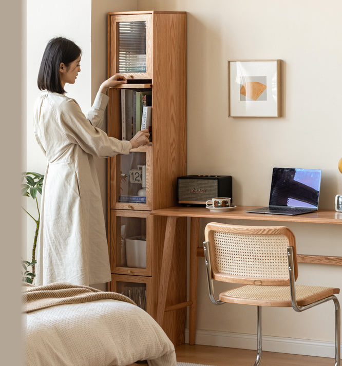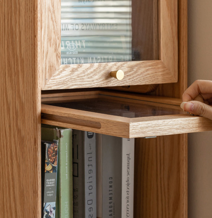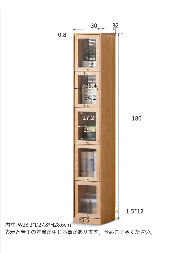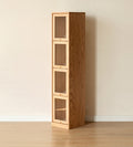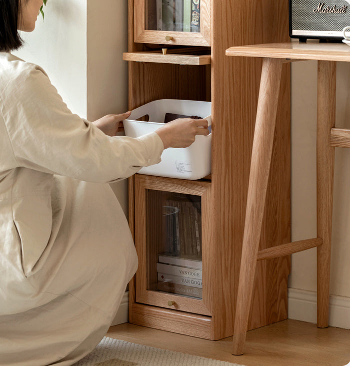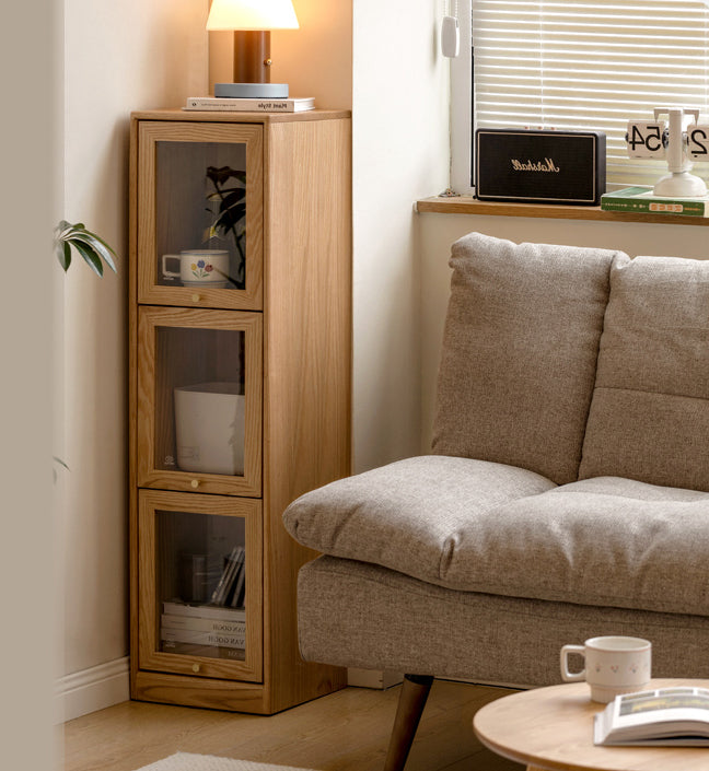 幅わずか30〜40cmの超薄型デザインが魅力の収納棚。天然オーク無垢材の美しい木目が、リビングやキッチンの空間を上品に演出します。ガラス扉付きで中身が見やすく、引き出しも備えて整理整頓がスムーズ。大型の収納力を持ちながらもスリム設計で、省スペースに最適です。転倒防止設計で安全性にも配慮し、モダンかつナチュラルなヴィンテージ風の雰囲気がインテリアに洗練されたアクセントを添えます。
